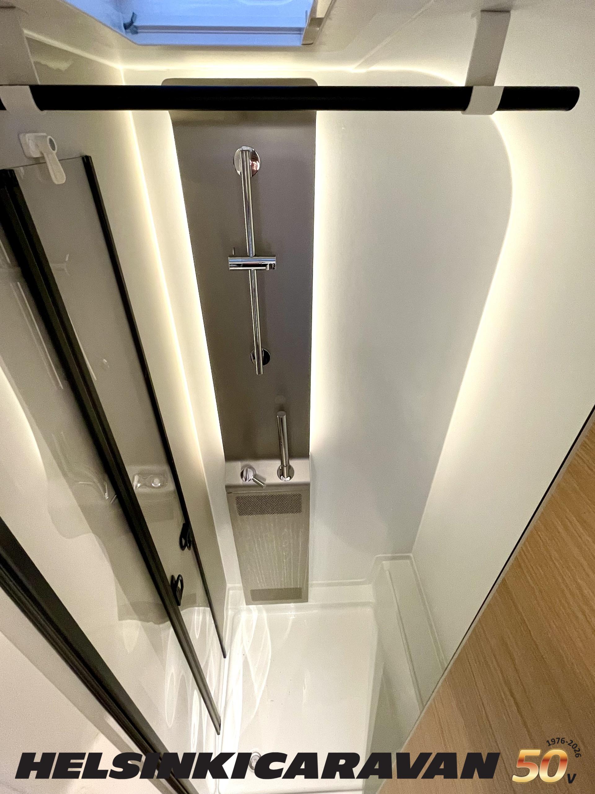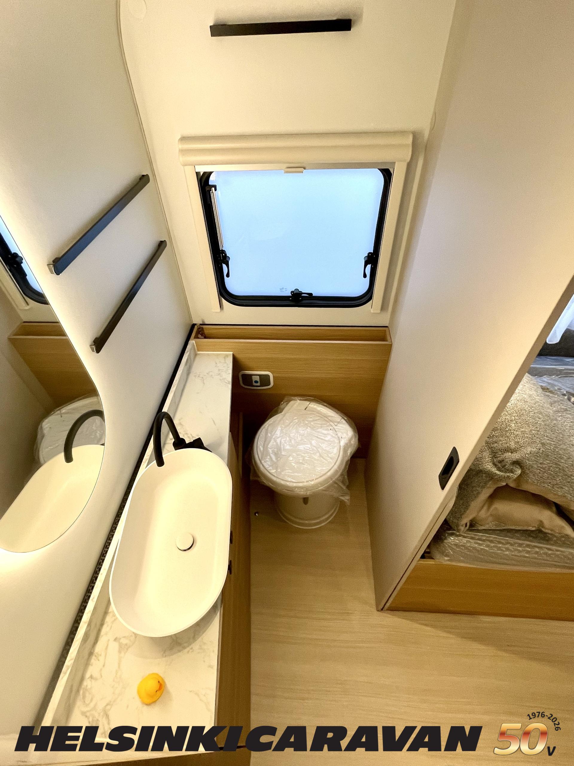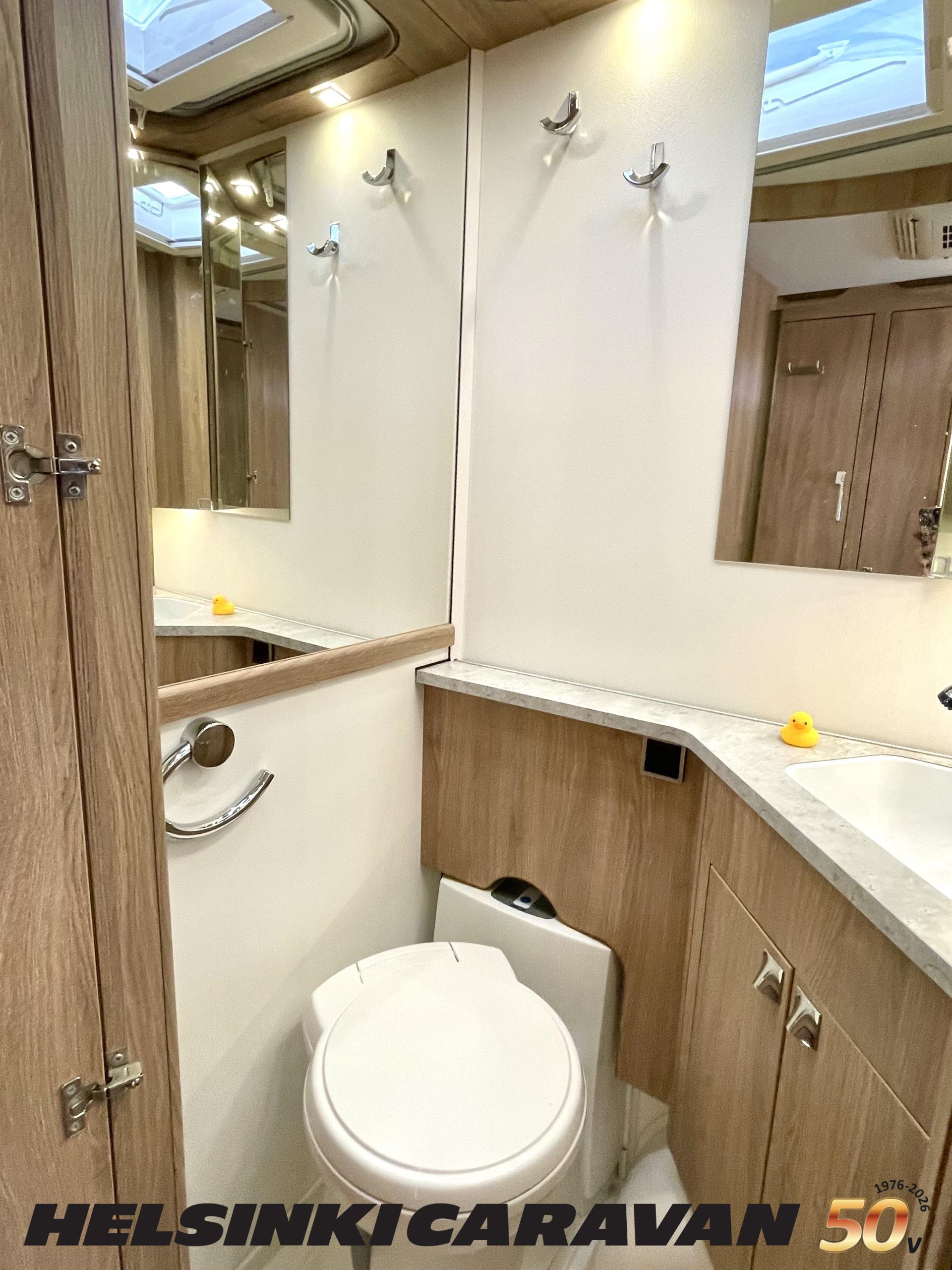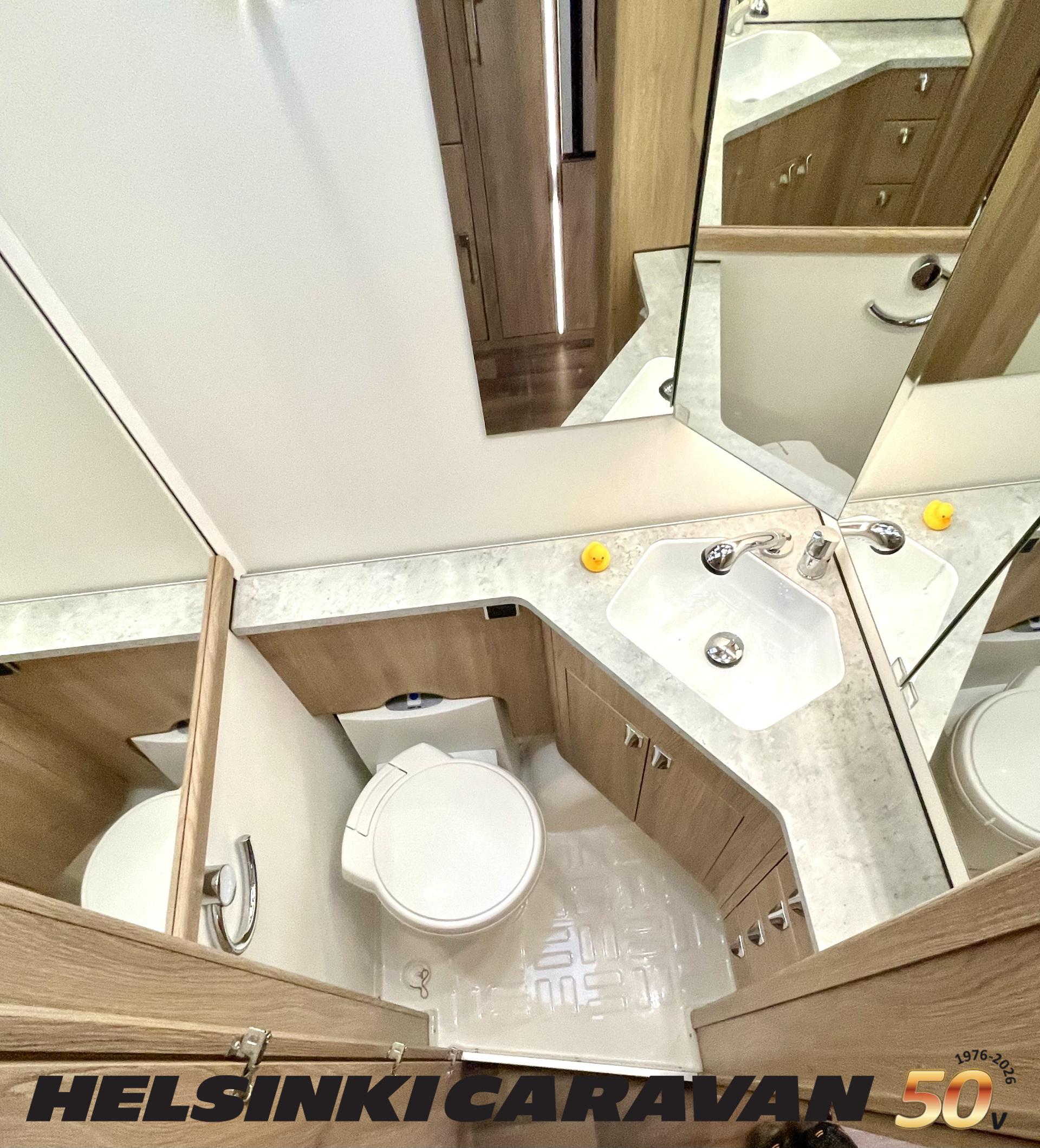 Tilavassa erillisessä wc/suihkutilassa on kääntyvä istuin, peilikaapisto ja oma kattoluukku luonnonvalon ja ilmanvaihdon maksimoimiseksi.