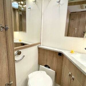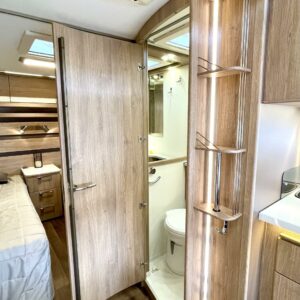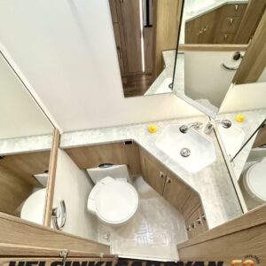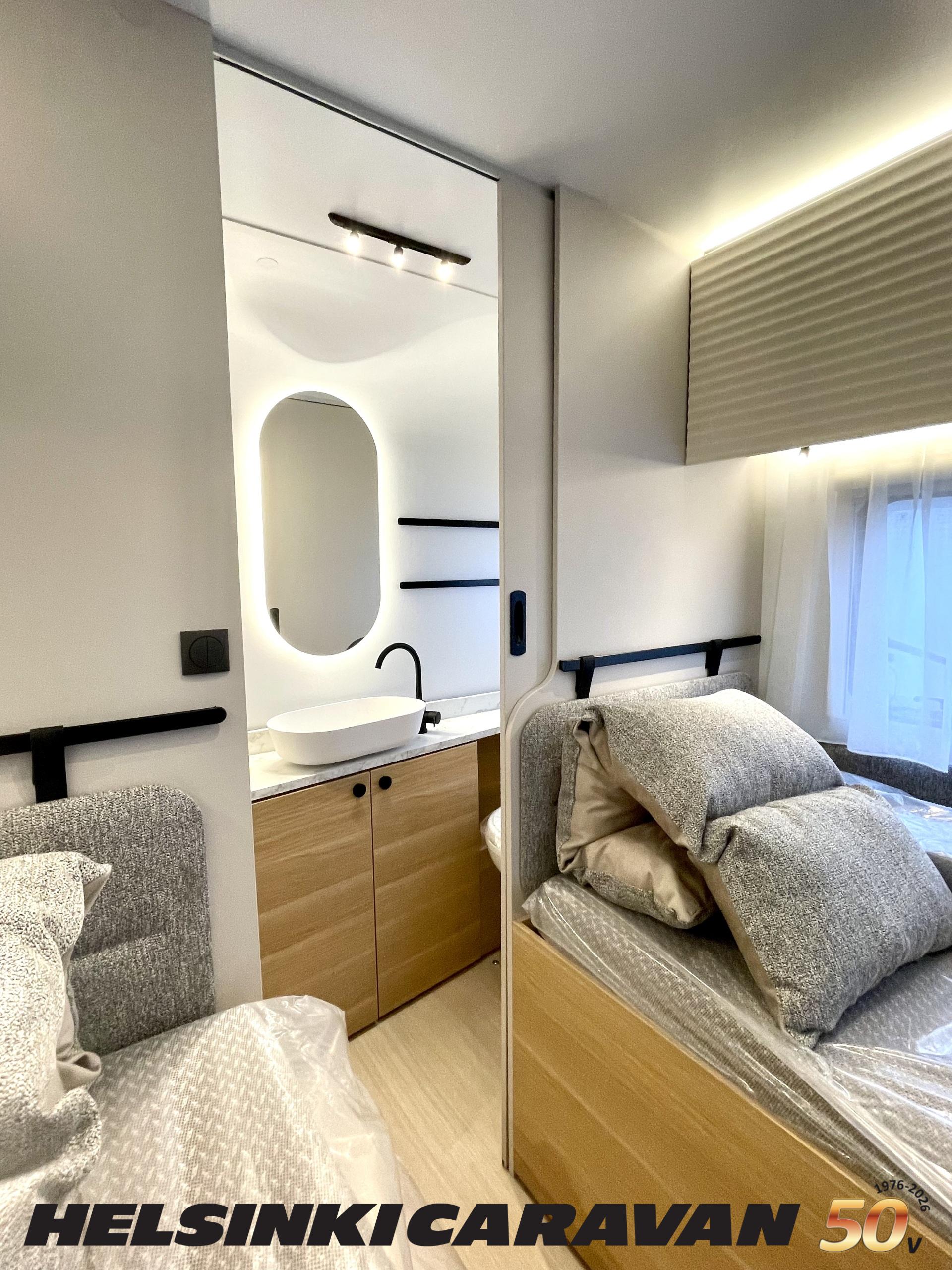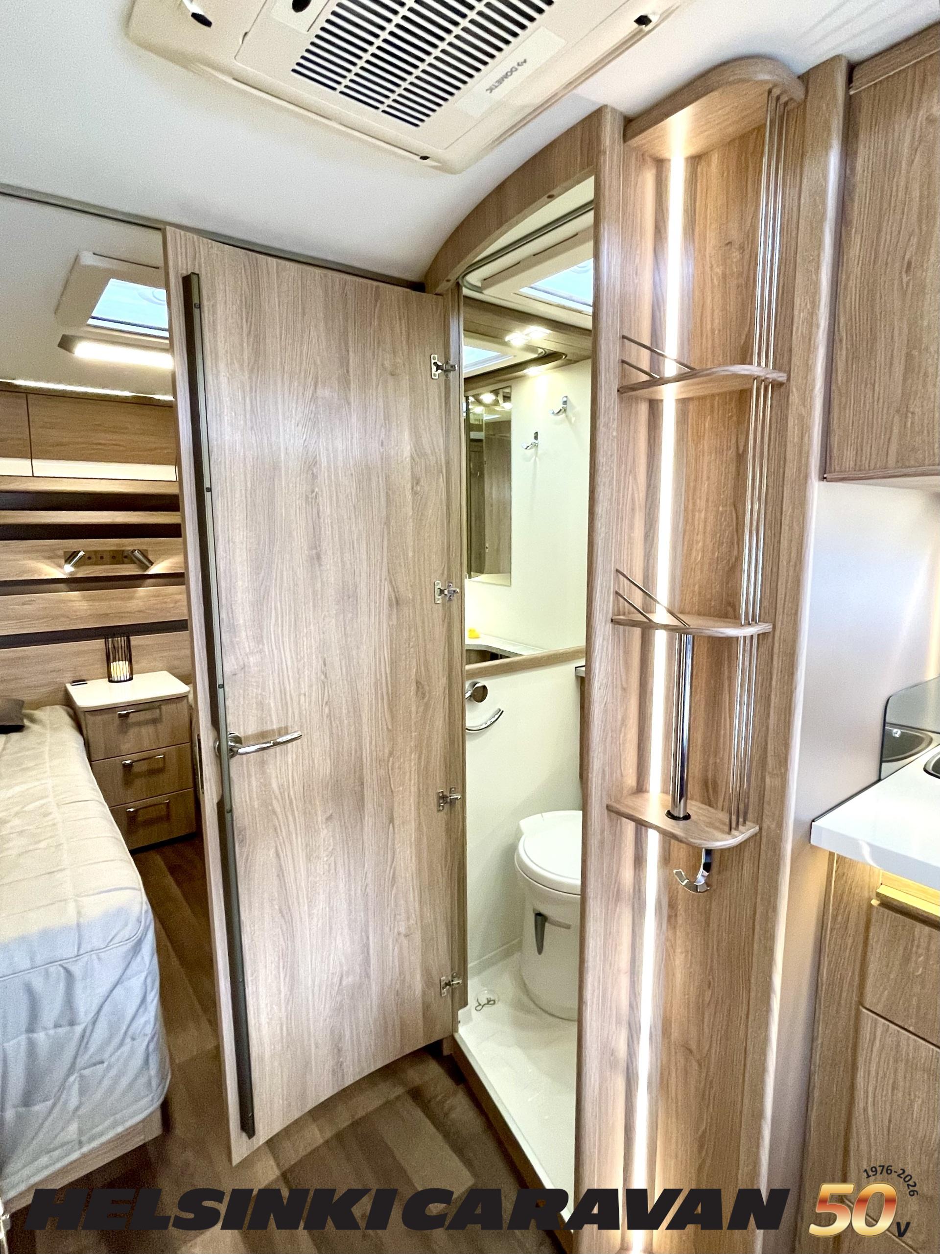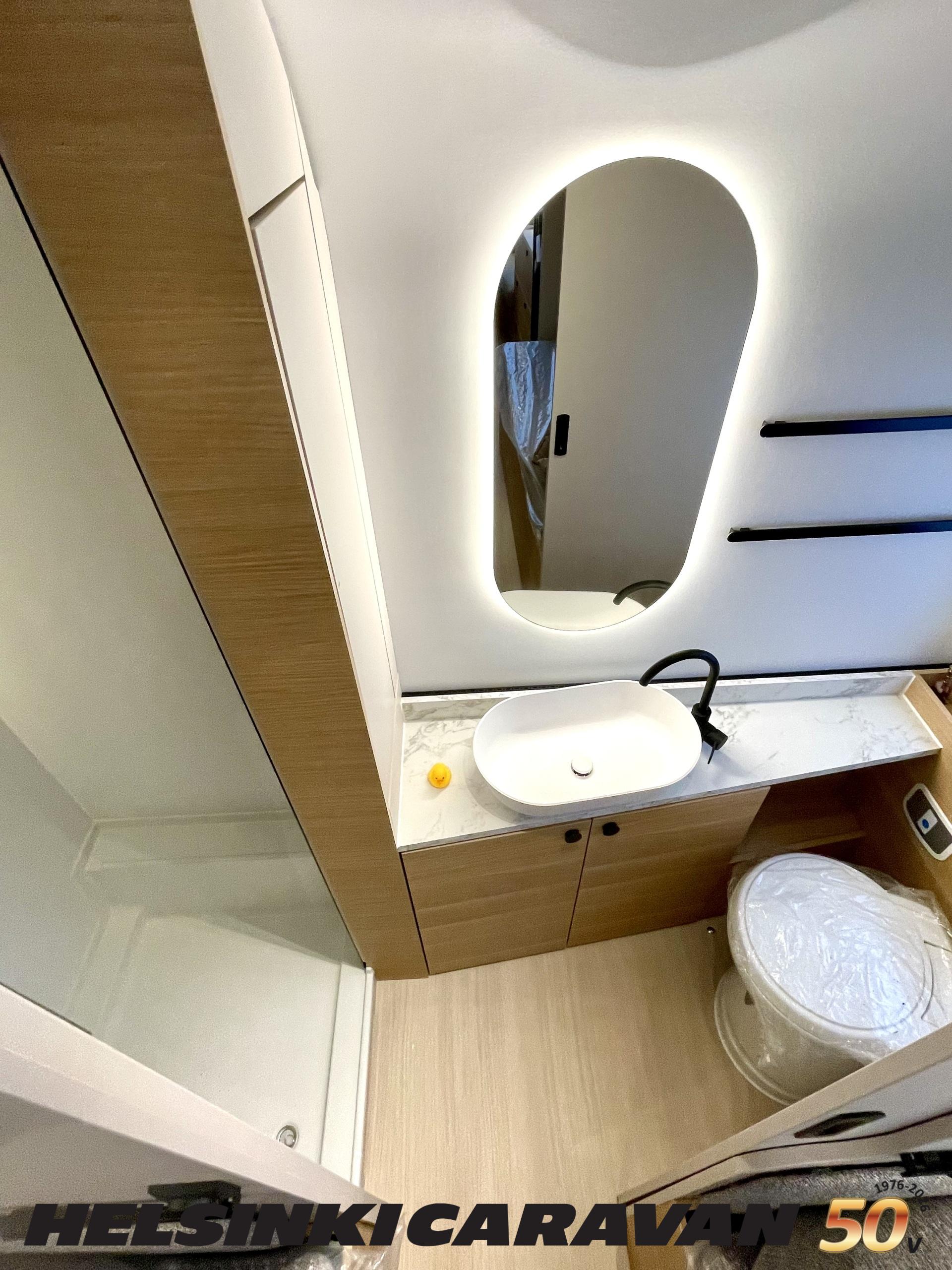 Tilavassa erillisessä wc/suihkutilassa on kääntyvä istuin, peilikaapisto ja oma kattoluukku luonnonvalon ja ilmanvaihdon maksimoimiseksi.