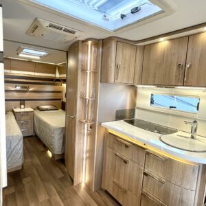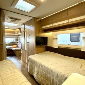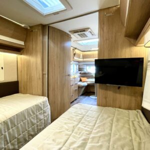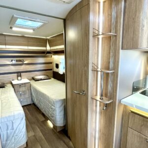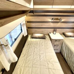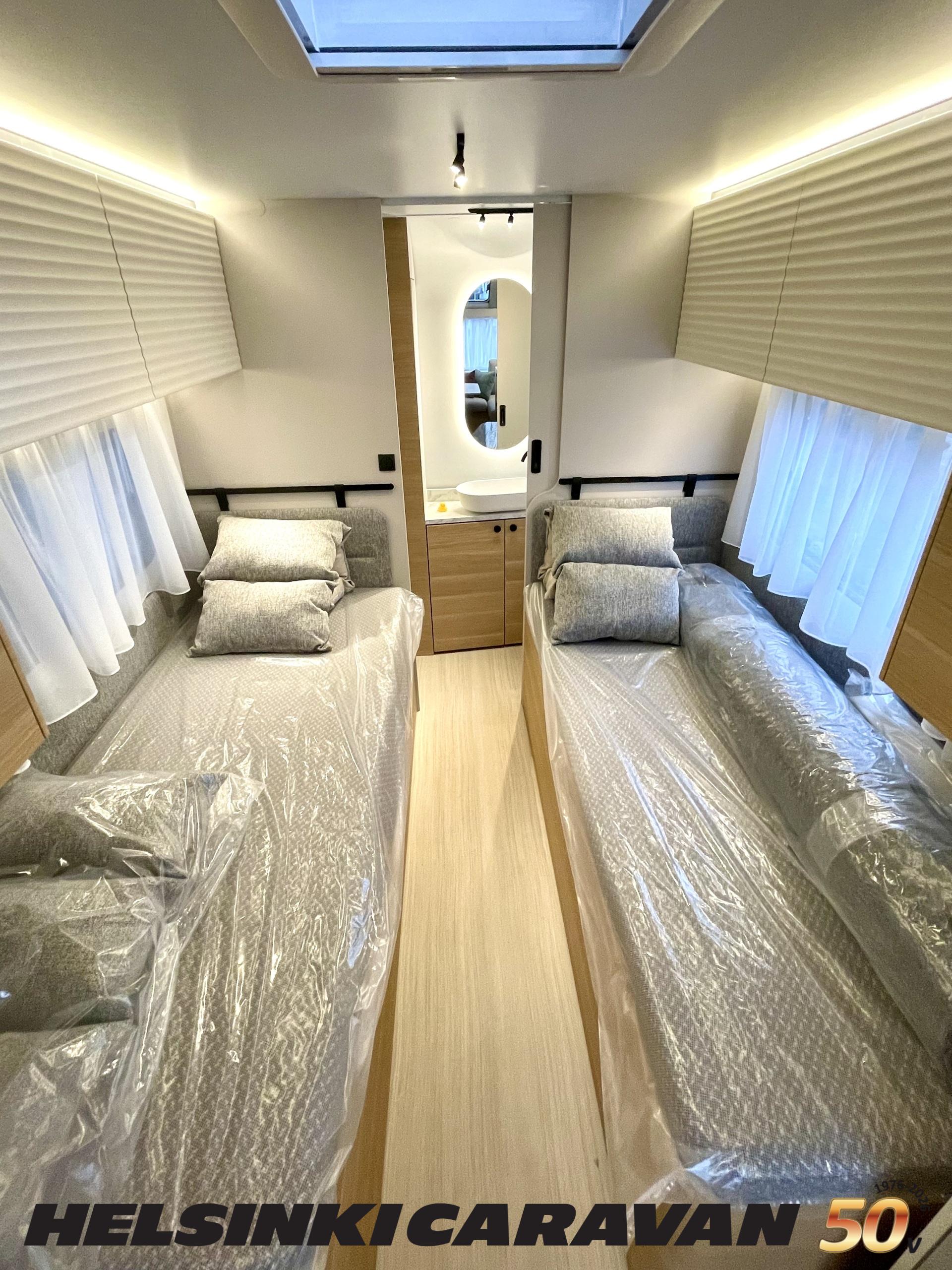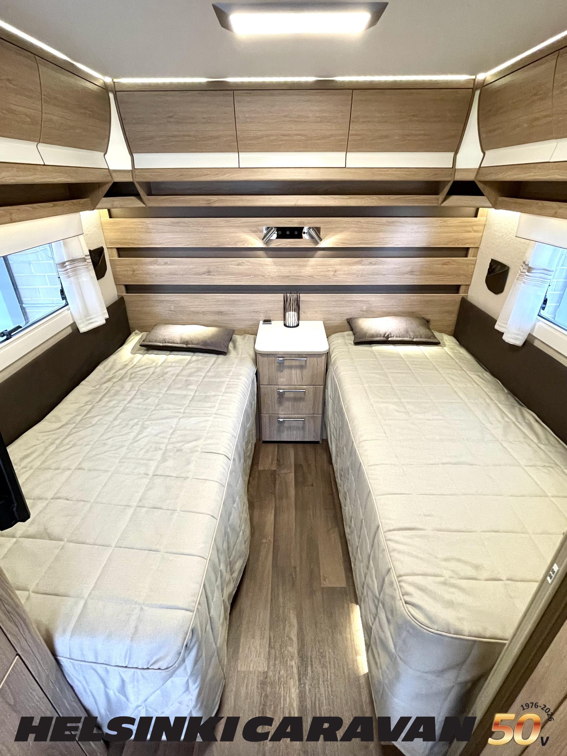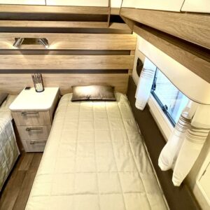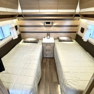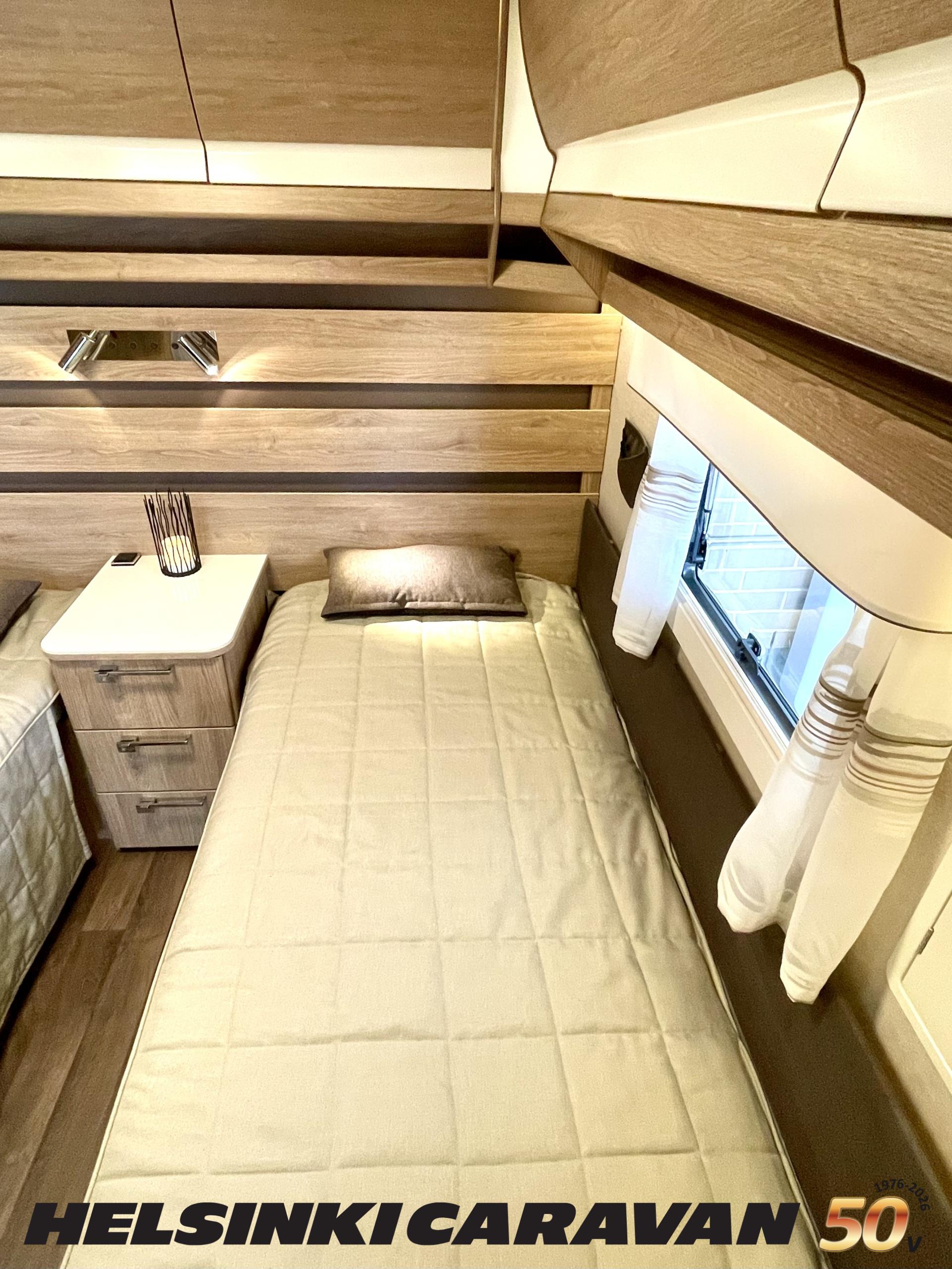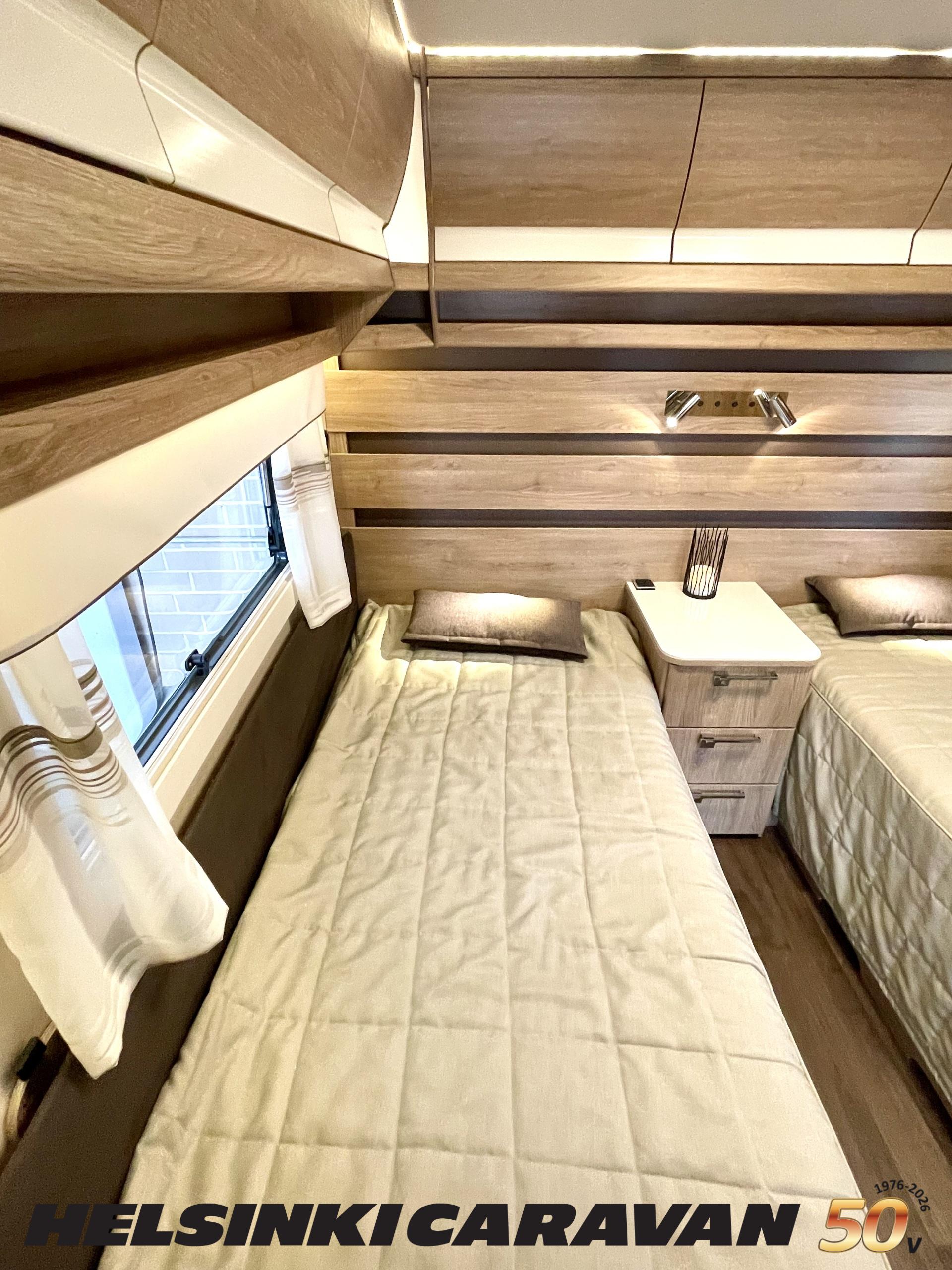 Makuuosaston 90cm leveät erillisvuoteet on varustettu taittuvalla päädyllä parhaan lepoasennon saamiseksi. Sänkyjen alle sujautat isommat tavarat silmältä piiloon, toisen sängyn alle pääsee myös ulkopuolelta huoltoluukun kautta. Sänkyjen välillä on näppärän kokoinen yöpöytä, ominaisuus jota etenkin silmälasien käyttäjät arvostavat. Latautuupa siinä puhelinkin yön aikana ollen helposti saatavalla jos tarve tulee.