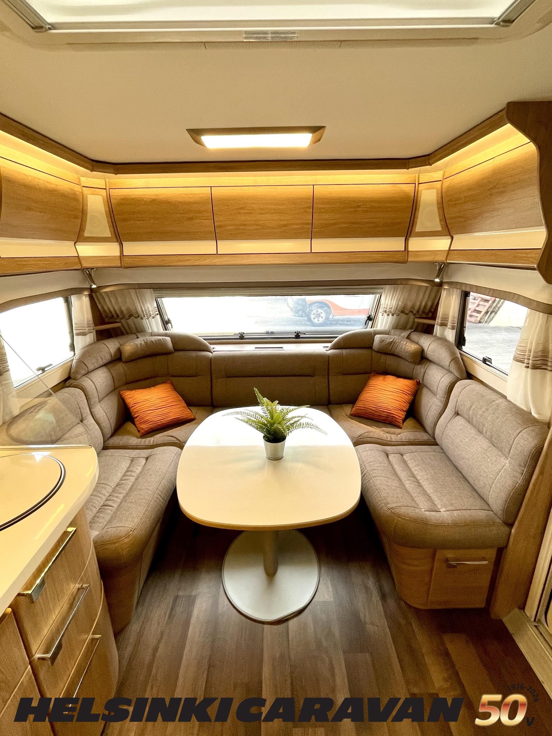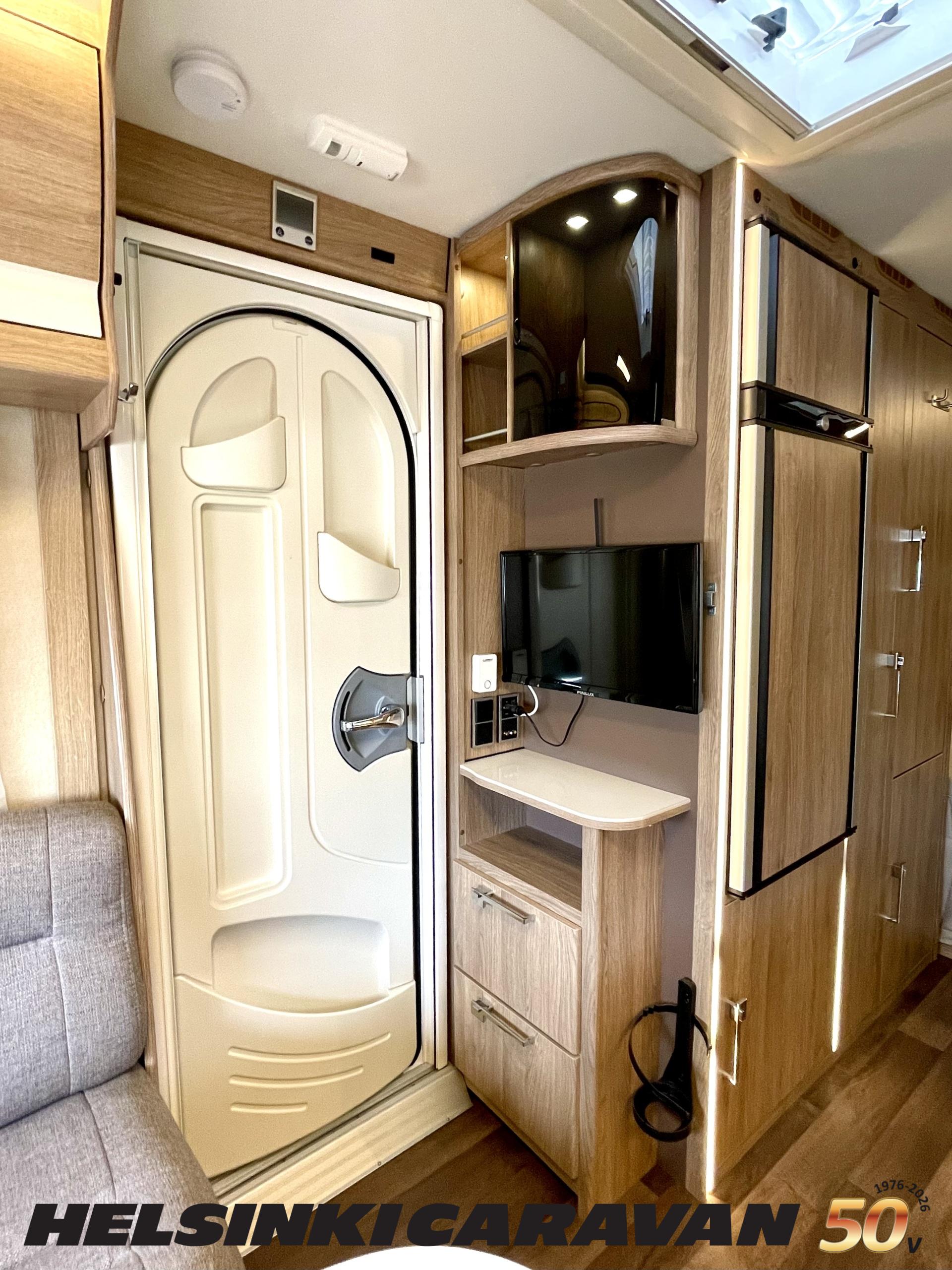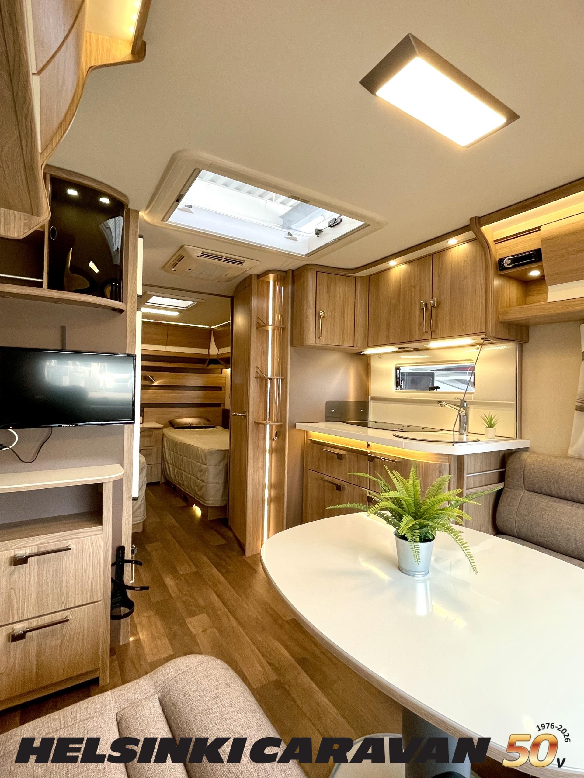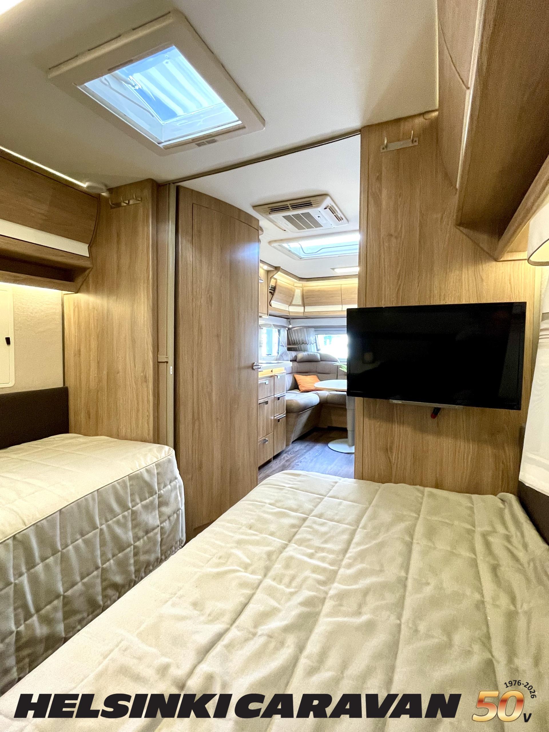 Etuosan suuren U-sohvaryhmän äärellä sujuu viikonloppubrunssi siinä missä salkkarimaratoonin tuijottelukin. Toinen tv-piste on kytketty makuukammarin puolelle, joten mikäli ohjelmavalikoimasta ei päästä yhteisymmärrykseen on apu lähellä (vaunussa on valmiina kaksi televisiota, DVB-T2 digivastaanottimen toimintaa ei tarkastettu).