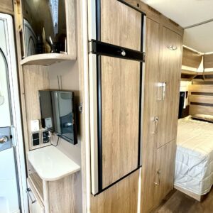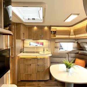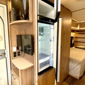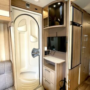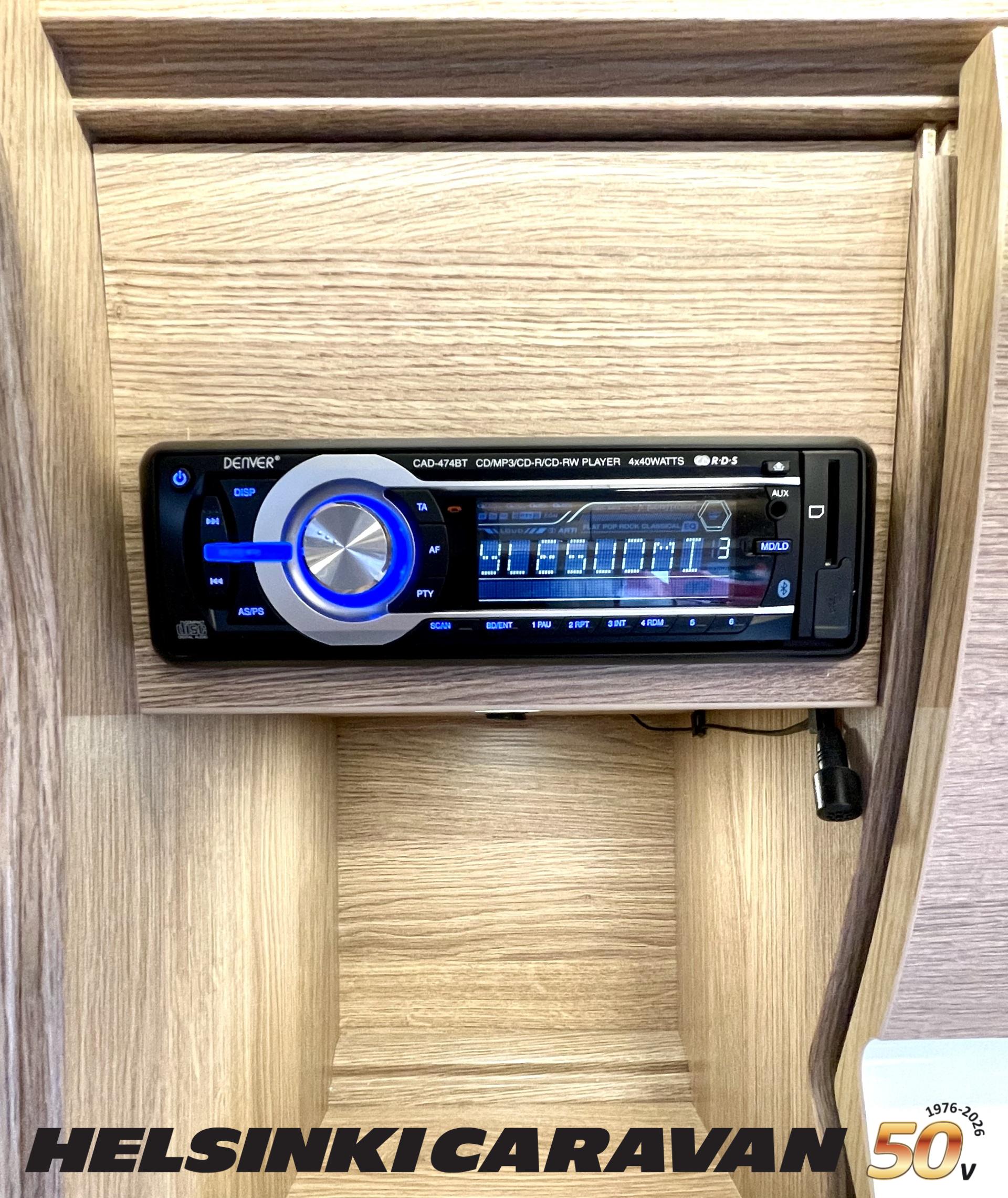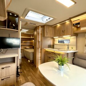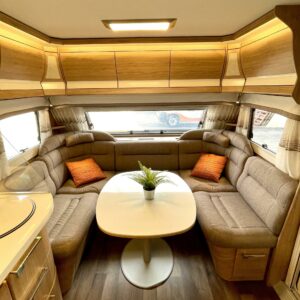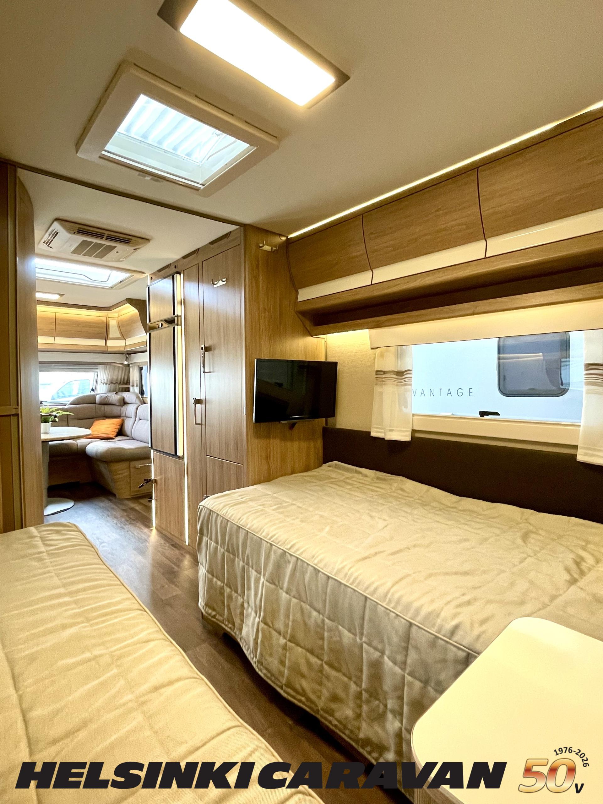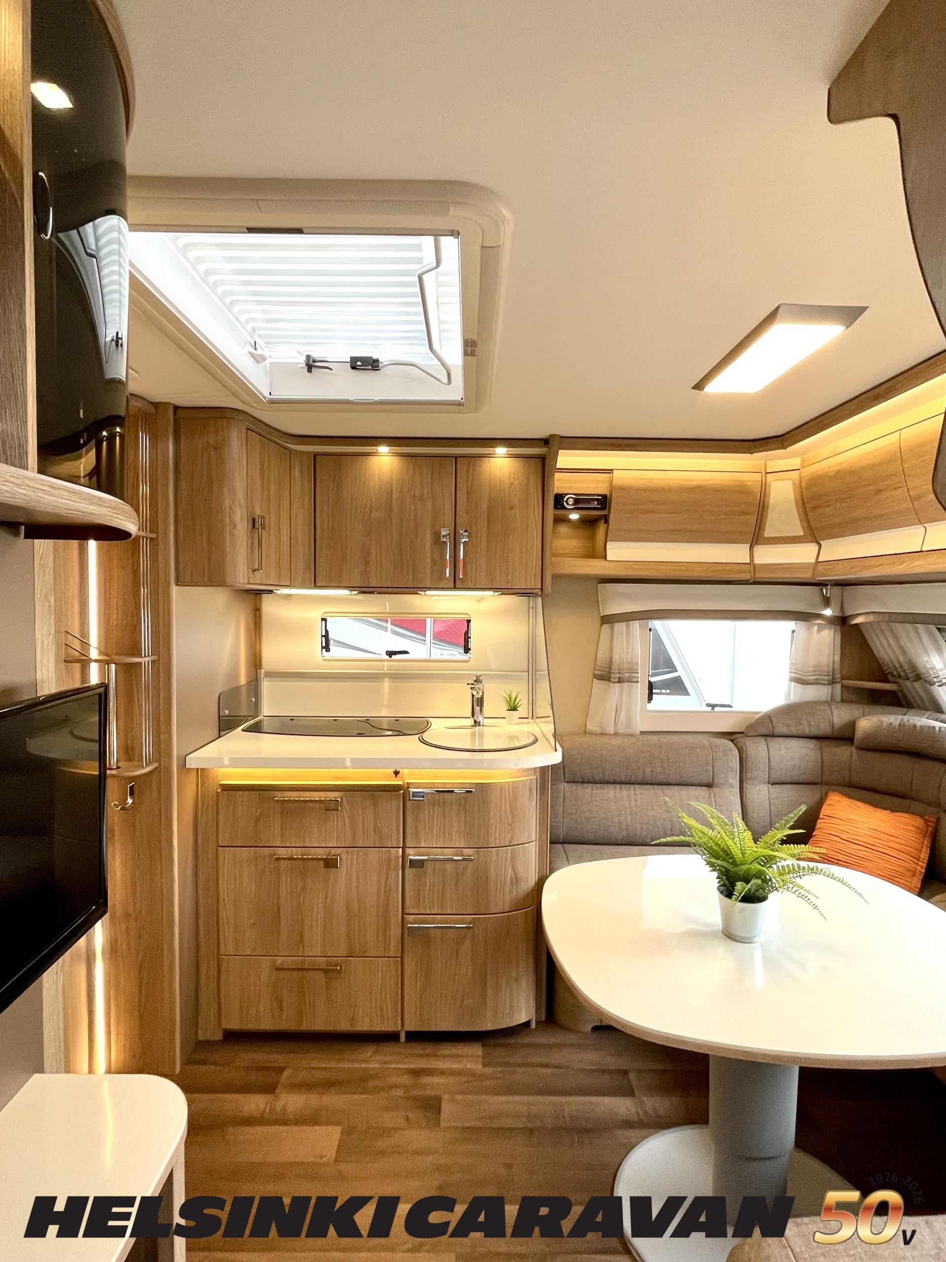Etuosan suuren U-sohvaryhmän äärellä sujuu viikonloppubrunssi siinä missä salkkarimaratoonin tuijottelukin. Toinen tv-piste on kytketty makuukammarin puolelle, joten mikäli ohjelmavalikoimasta ei päästä yhteisymmärrykseen on apu lähellä (vaunussa on valmiina kaksi televisiota, DVB-T2 digivastaanottimen toimintaa ei tarkastettu).