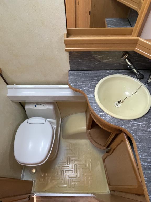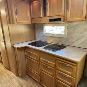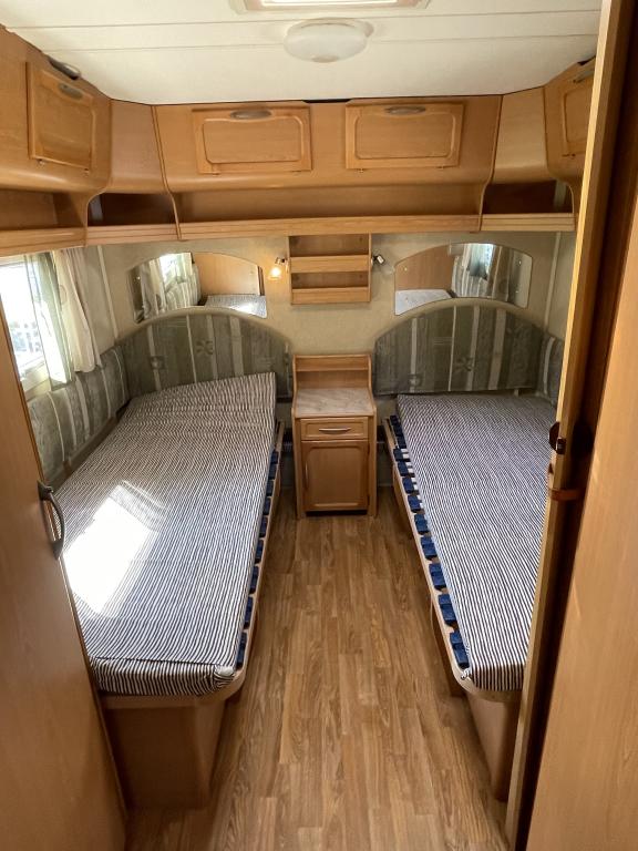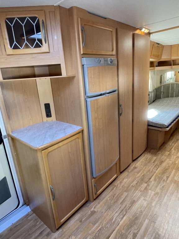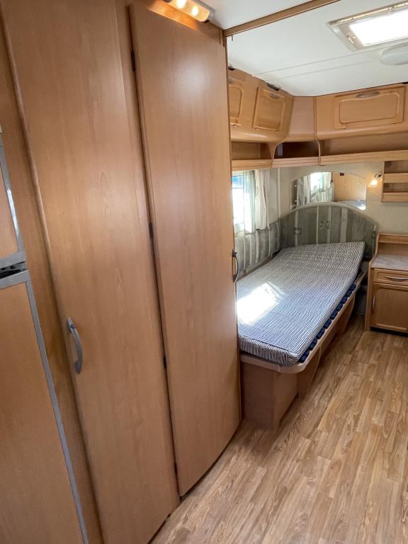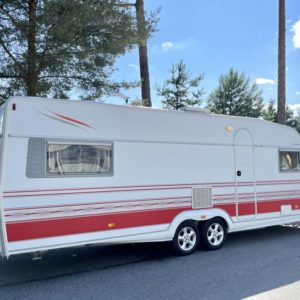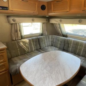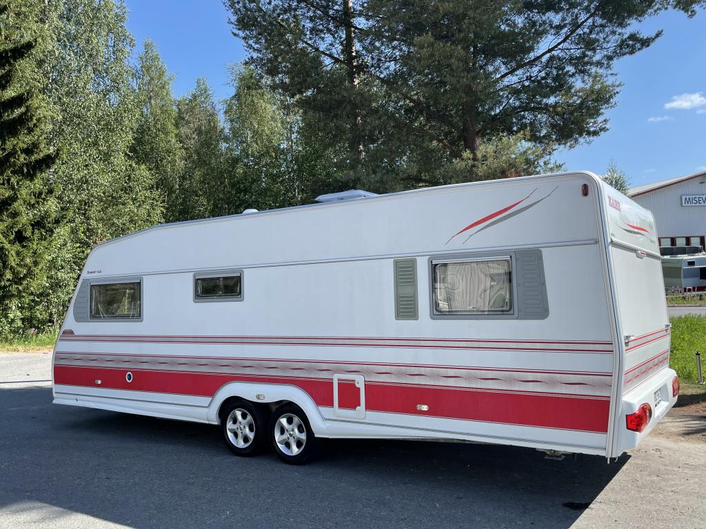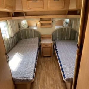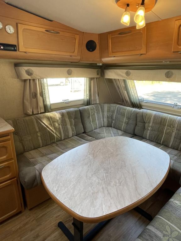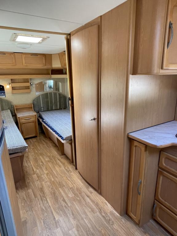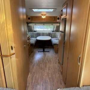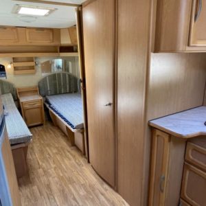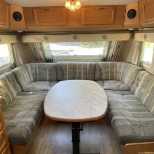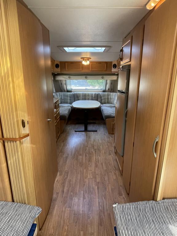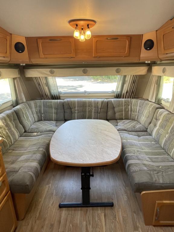 Tilava vaunu jossa pohjaratkaisussa edessä U- Sohvaryhmä. Keskiosassa keittiö sekä Suihku & Wc- tila. Takaosassa erillisvuoteet.