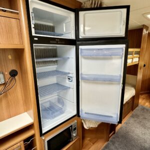 Muutaman askeleen kohti vaunun takapäätä siirtymällä pääsee jokaisen karavaanikokin unelmakeittiöön, josta löytyy ison kaasu- uunin ja lieden lisäksi täyskorkea jääkaappi- pakastin ja mikroaaltouuni.
