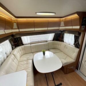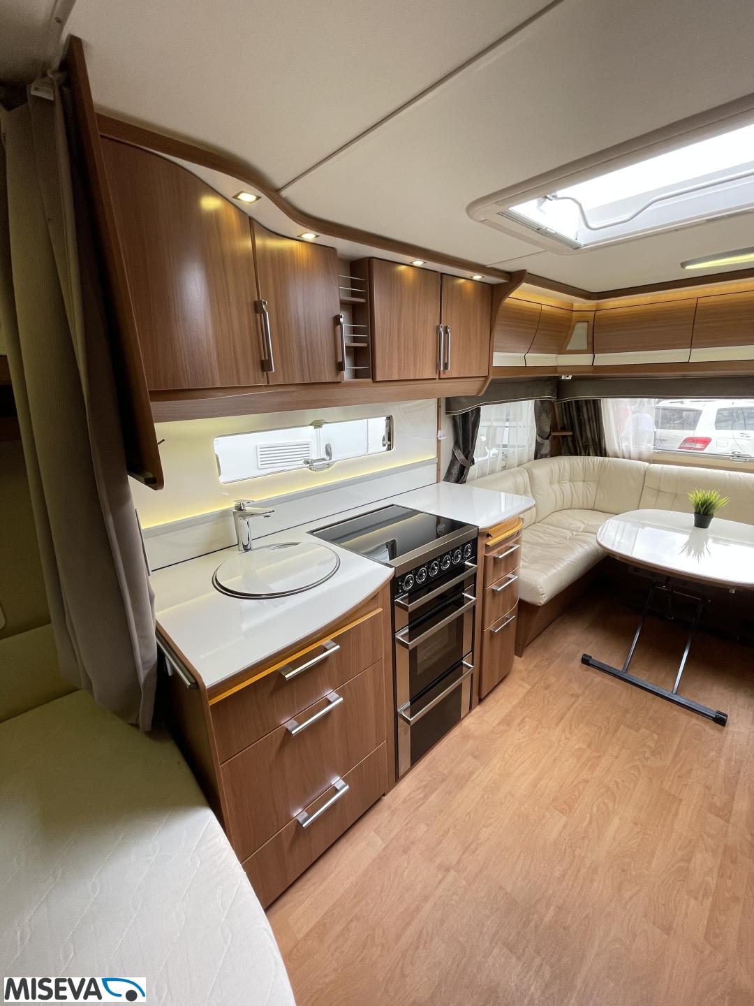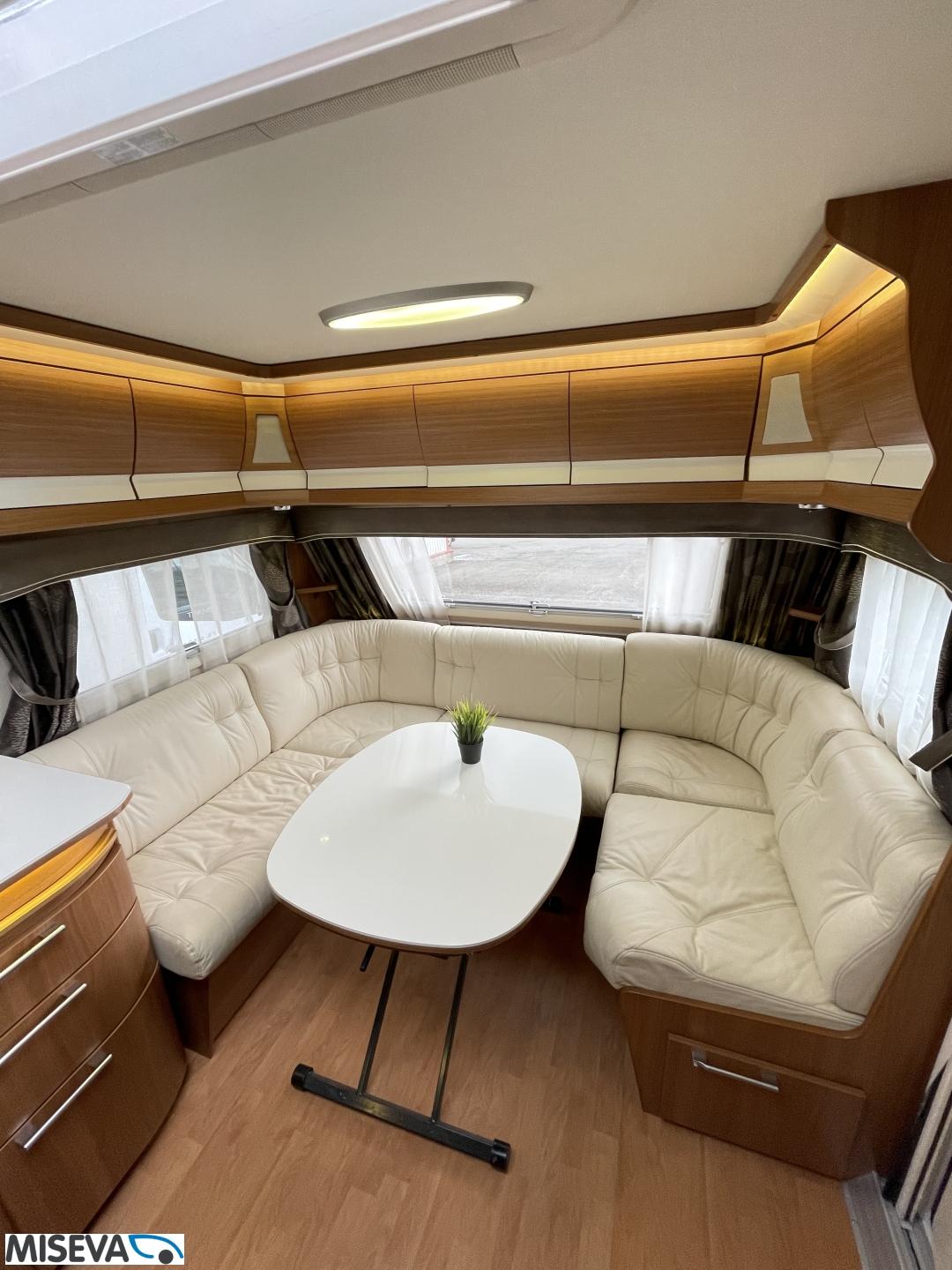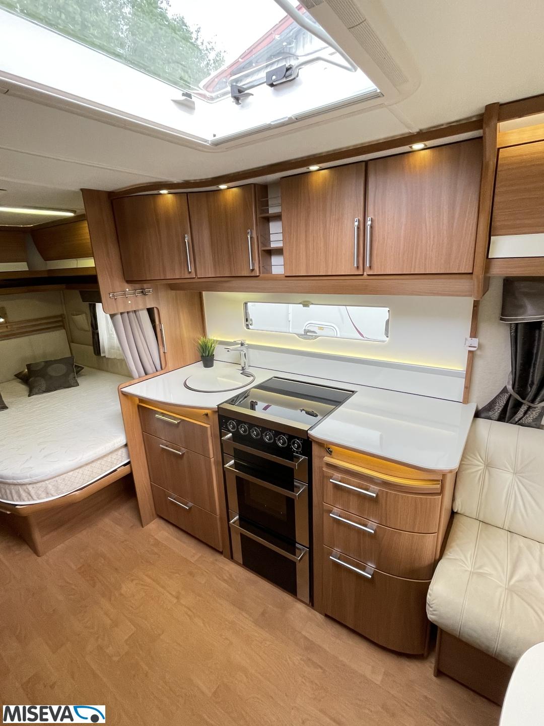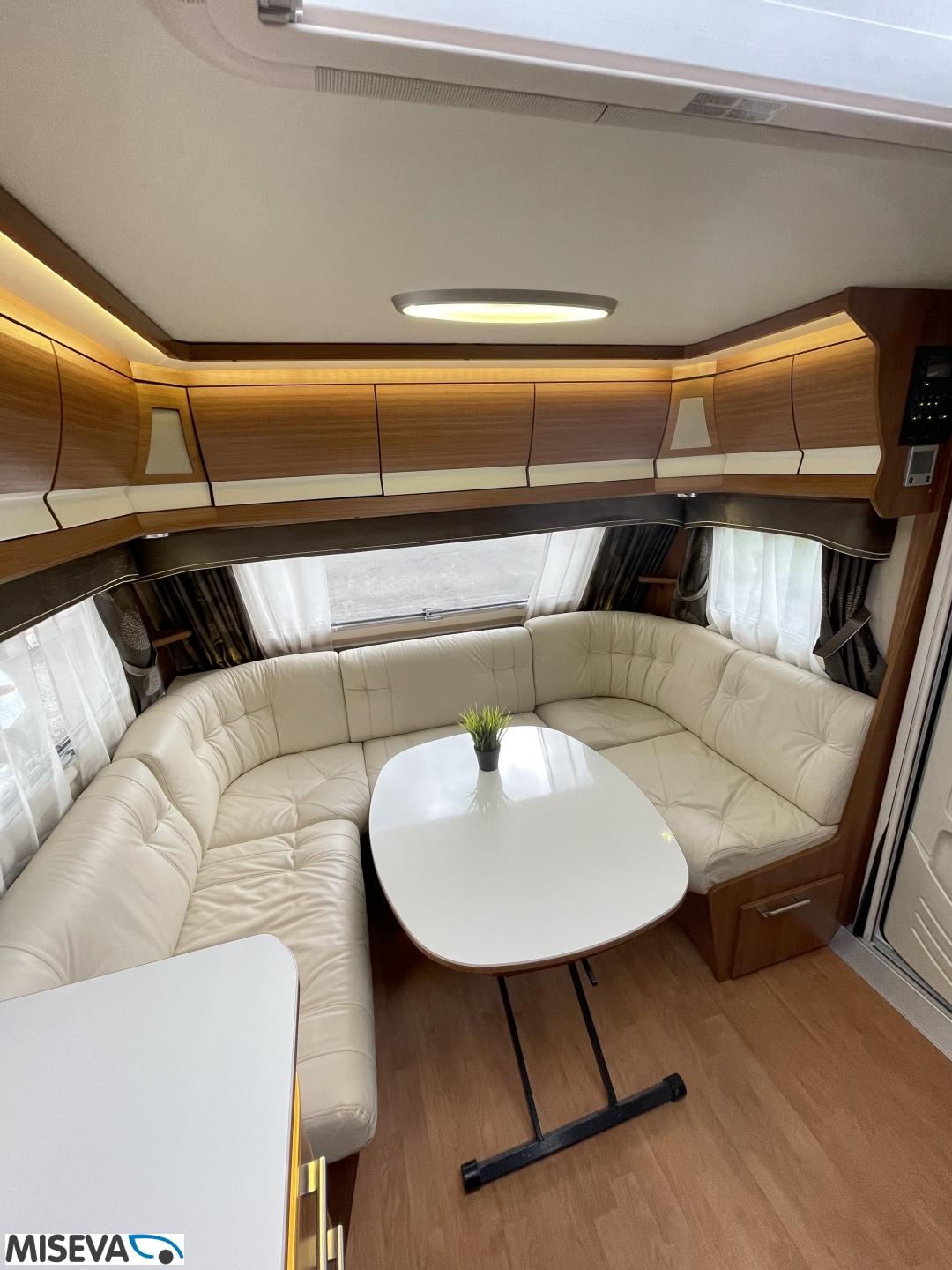 Avarien sisätilojen takeena King Size- malliston 2,5 m kokonaisleveys. Vaunun takaosassa pitkittäinen parivuode ja pesuhuone/ WC, edessä viihtyisä nahkaverhoiltu U- ryhmä. Keittiön varustukseen kuuluu ison jääkaappi- pakastimen lisäksi kaasu- uuni.
