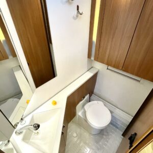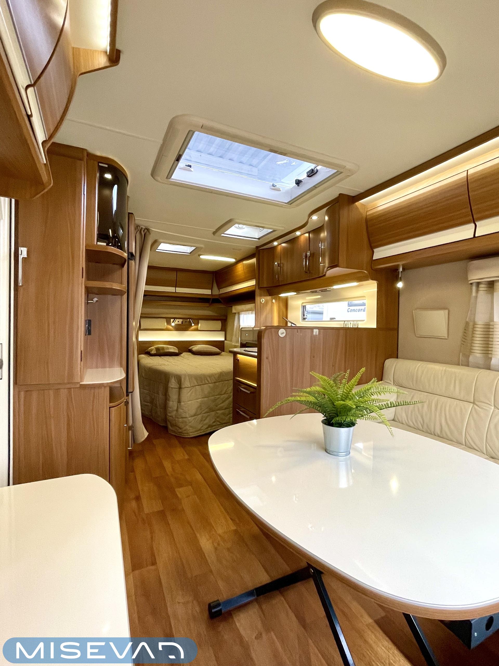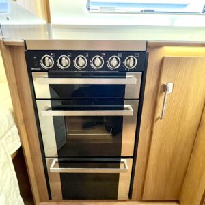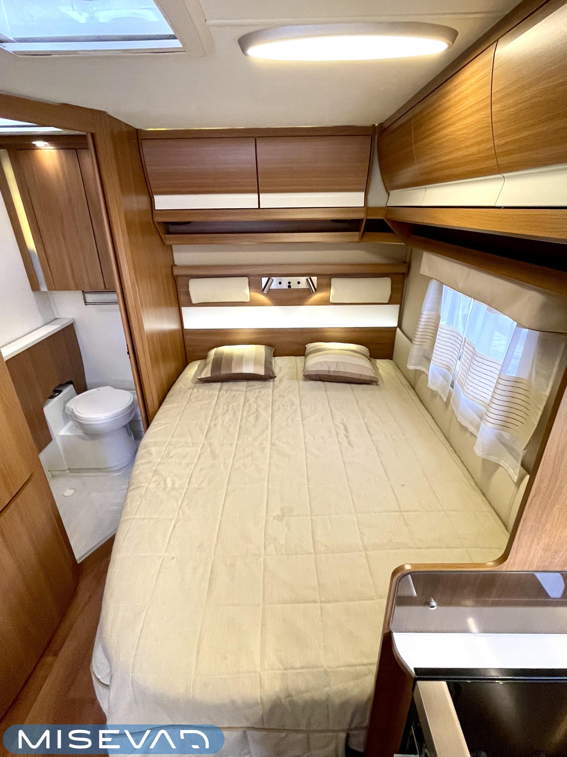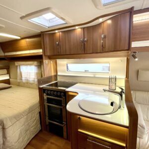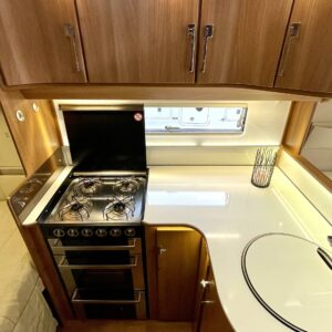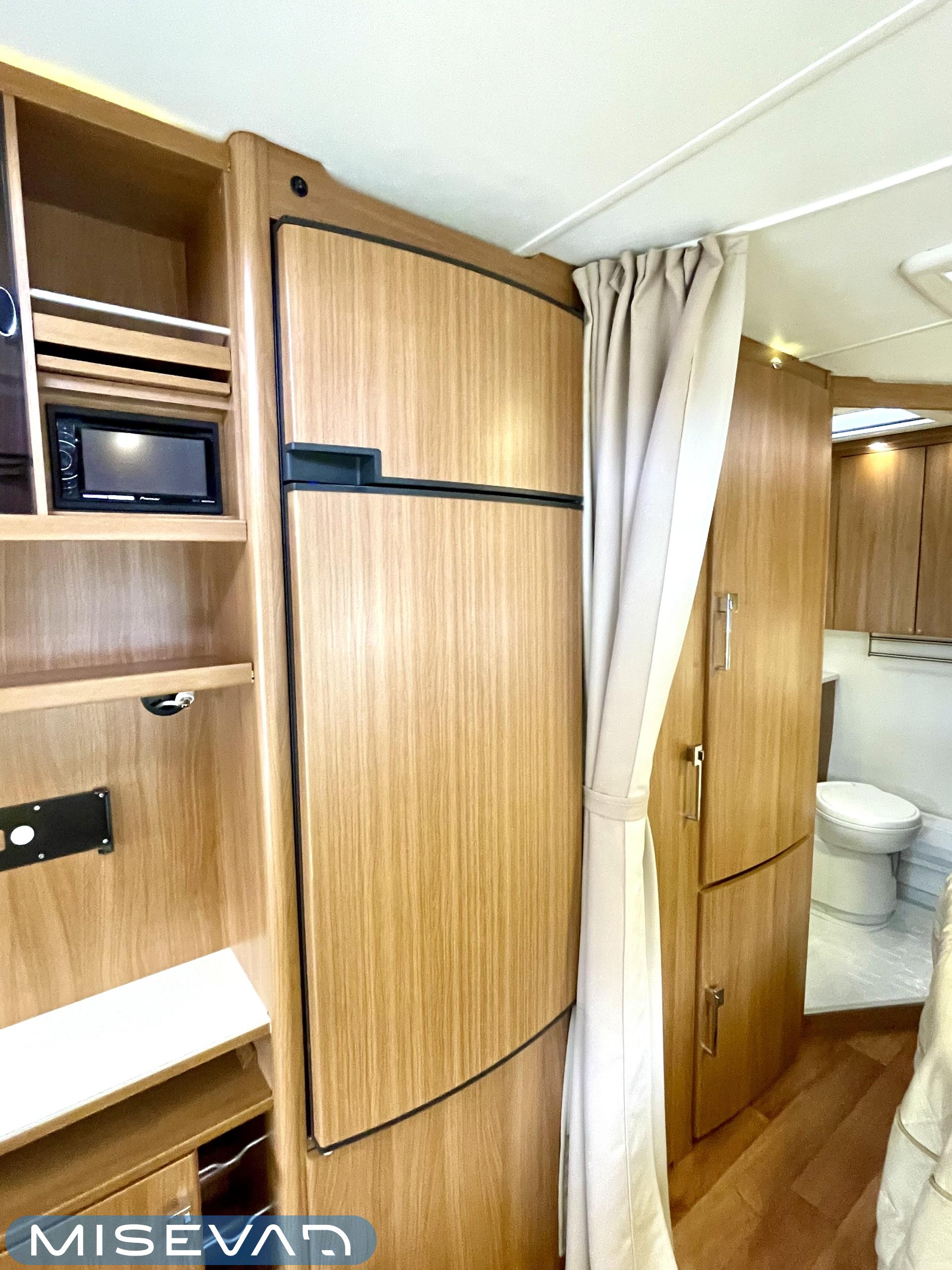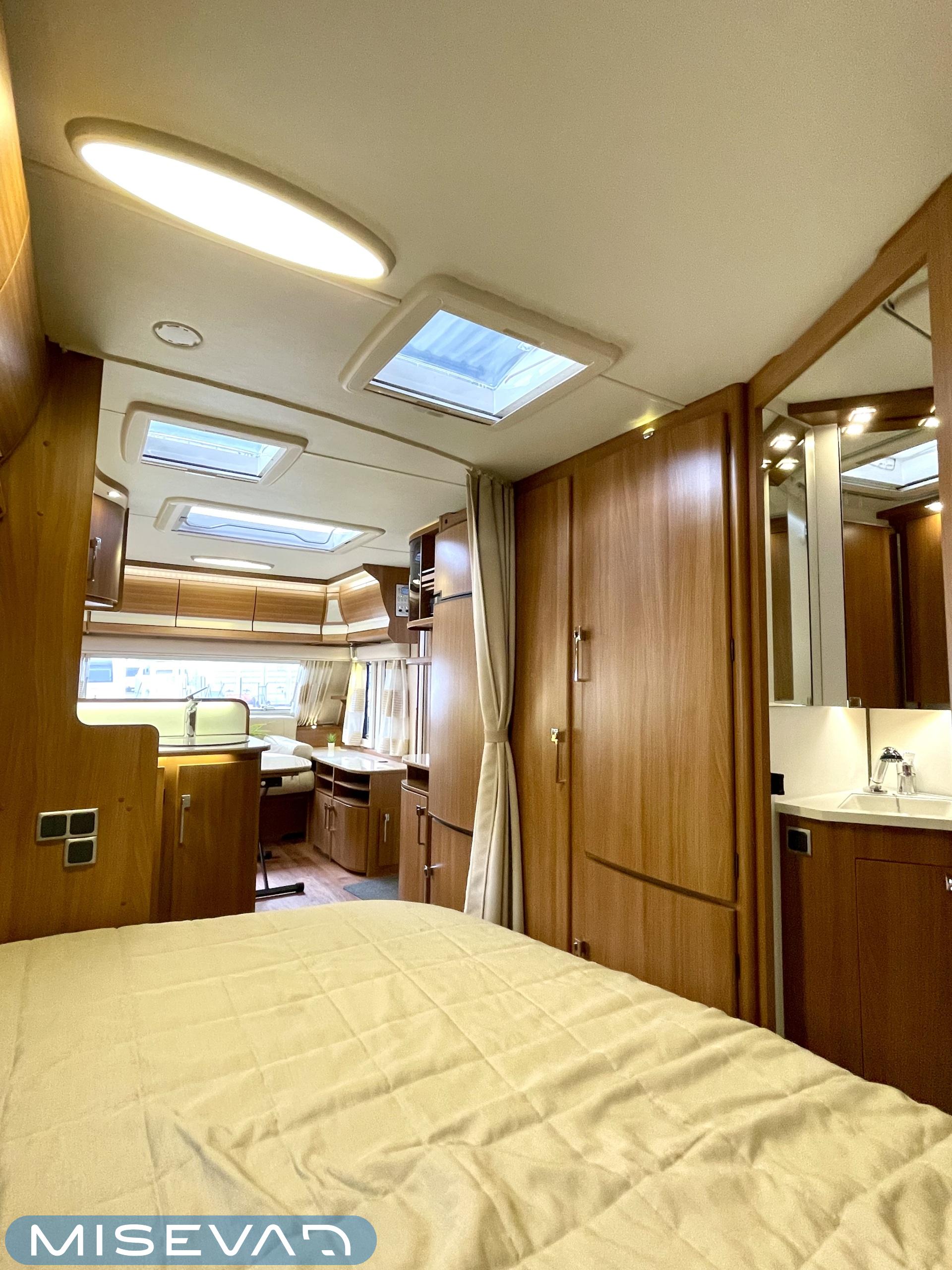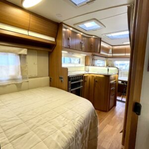 L-mallisesta keittiöstä löytyvät kaikki mukavuudet liettä ja kaasu-uunia myöten. Jääkaappi on mallia ”se isompi” ja toimii sekä kaasulla että sähköllä. Kaappitilakaan ei vaunusta heti kesken lopu. Takaosaa hallitsevat leveä parivuode ja mukavan kokoinen kylppäri pyyhekuivaustelineellä.