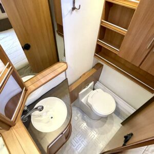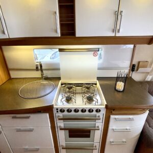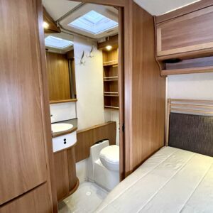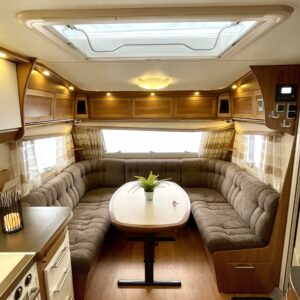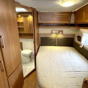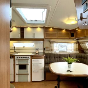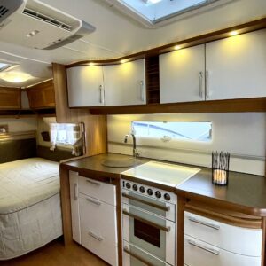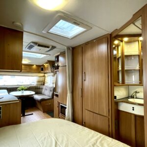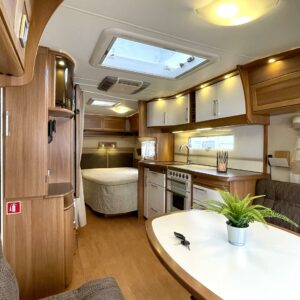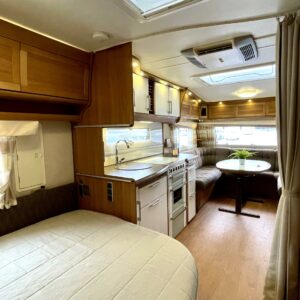 Upea Royal- malliston vaunu leveällä ja matalalla parivuoteella sekä huippuvarusteilla. Edessä avara U-istuinryhmä, joka sijattavissa isoksi parivuoteeksi. Keskellä keittiö, jossa reilusti laskutilaa sekä käytävä, josta mahtuu kokin ohi suurempikin seurue. Keskellä myös suuri jääkaappipakastin- yhdistelmä sekä valtavasti kaappitilaa. Eteisessä oven vieressä naulakko takeille sekä alhaalla kaappi kengille. Takana leveä parivuode, jonka alla suuri säilytystila sekä pesuhuone. Edessä monikäyttöinen suksien säilytyslaatikko.