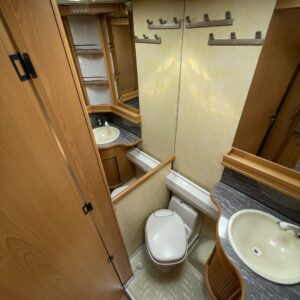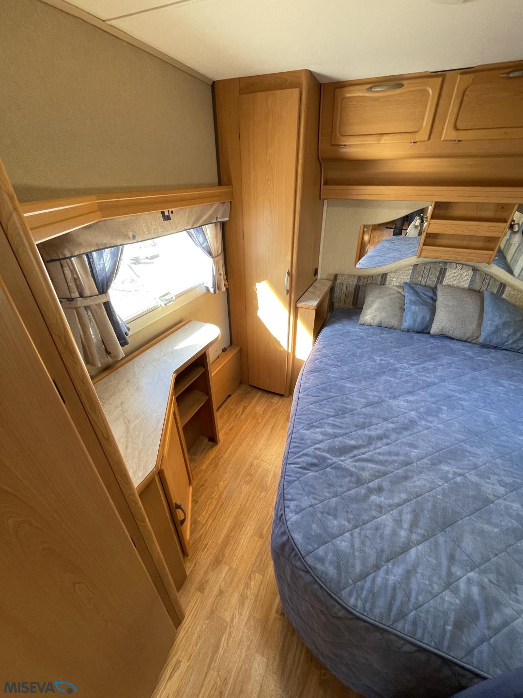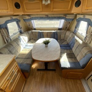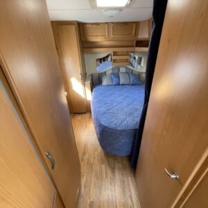 Leveä parivuode vaunun takaosassa, muhkea U- ryhmä edessä. Runsaasti säilytystilaa korkeissa vaatekaapeissa.