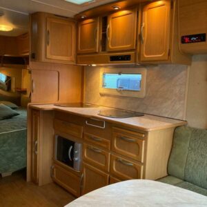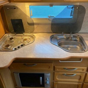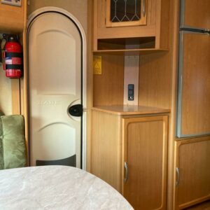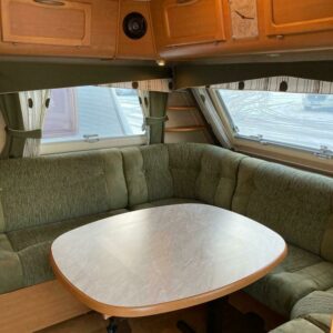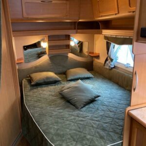 Edessä tilava U-ryhmä mistä saa sijattua parivuoteen. Keskellä keittiö varusteineen, sekä runsaasti säilytystilaa tavaroille. Takana pitkittäinen parivuode ja WC-tilat. Ollut edellisellä omistajalla 9 vuotta