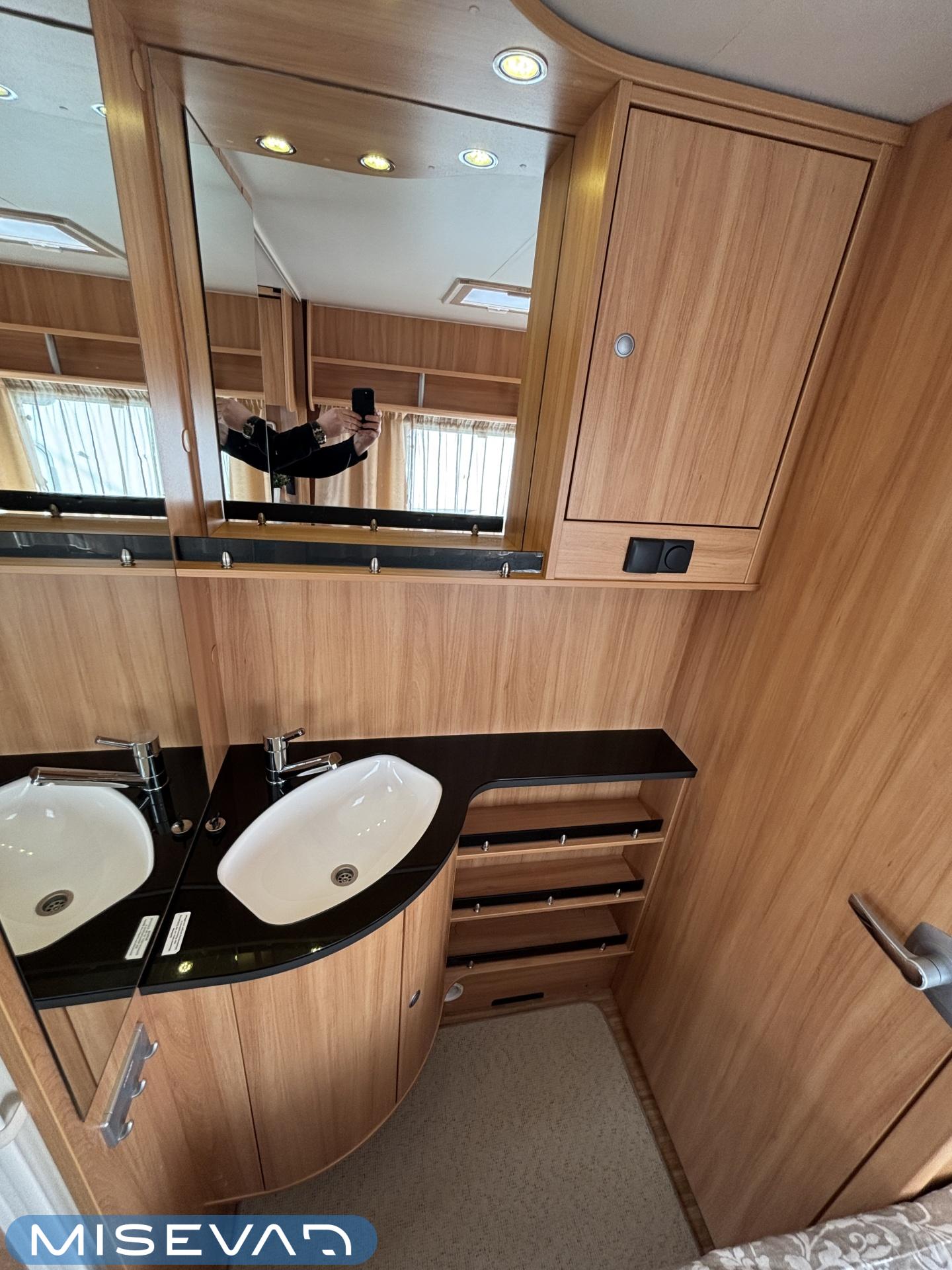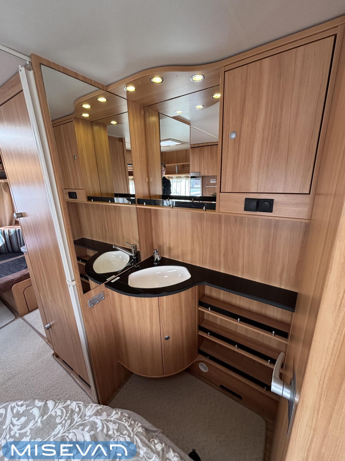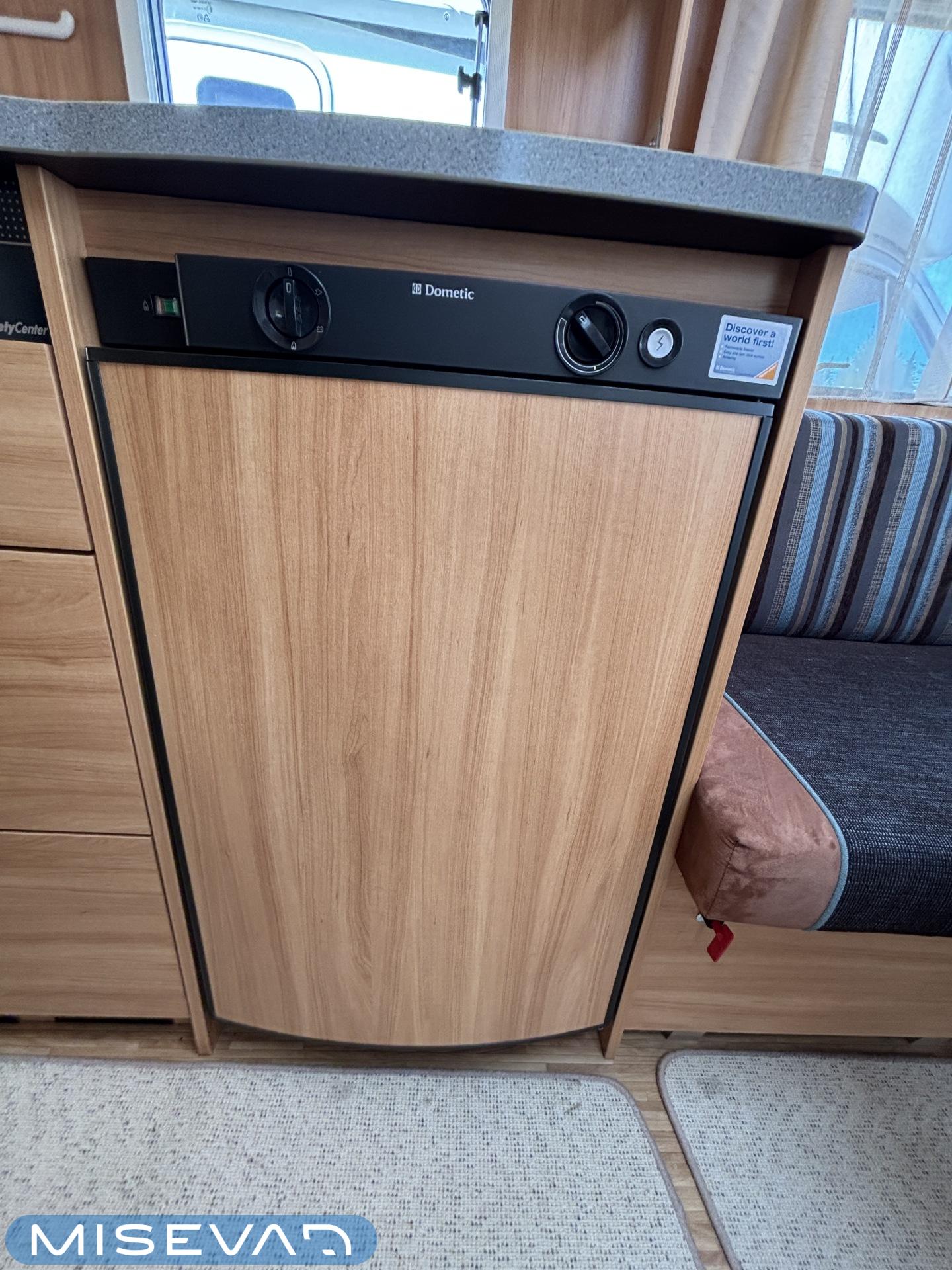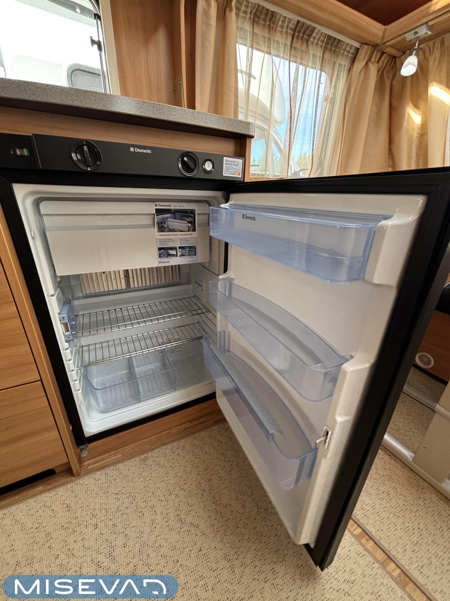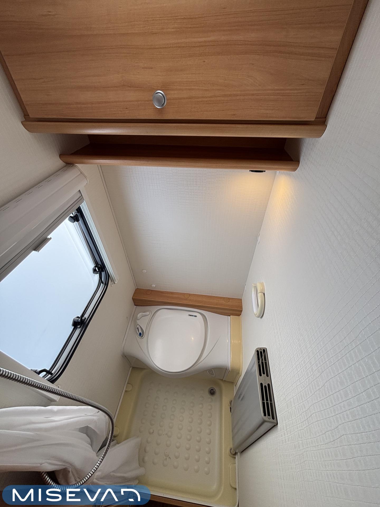 Vaunussa on leveä kolmitoimijääkaappi pakastelokerolla ja reilusti säilytystilaa, tilavat yläkaapistot kiertävät koko vaunun ympäri ja keittiötä vastapäätä majailee iso henkarikaappi päällysvaatteille. Wc/suihkutila sijatsee henkarikaappia vastapäätä. Tässäkin huoneessa on luonnonvaloa tarjoava kattoluukku olo- ja makuutilan tapaan.