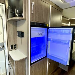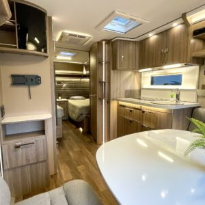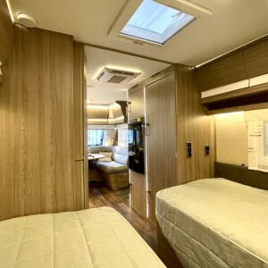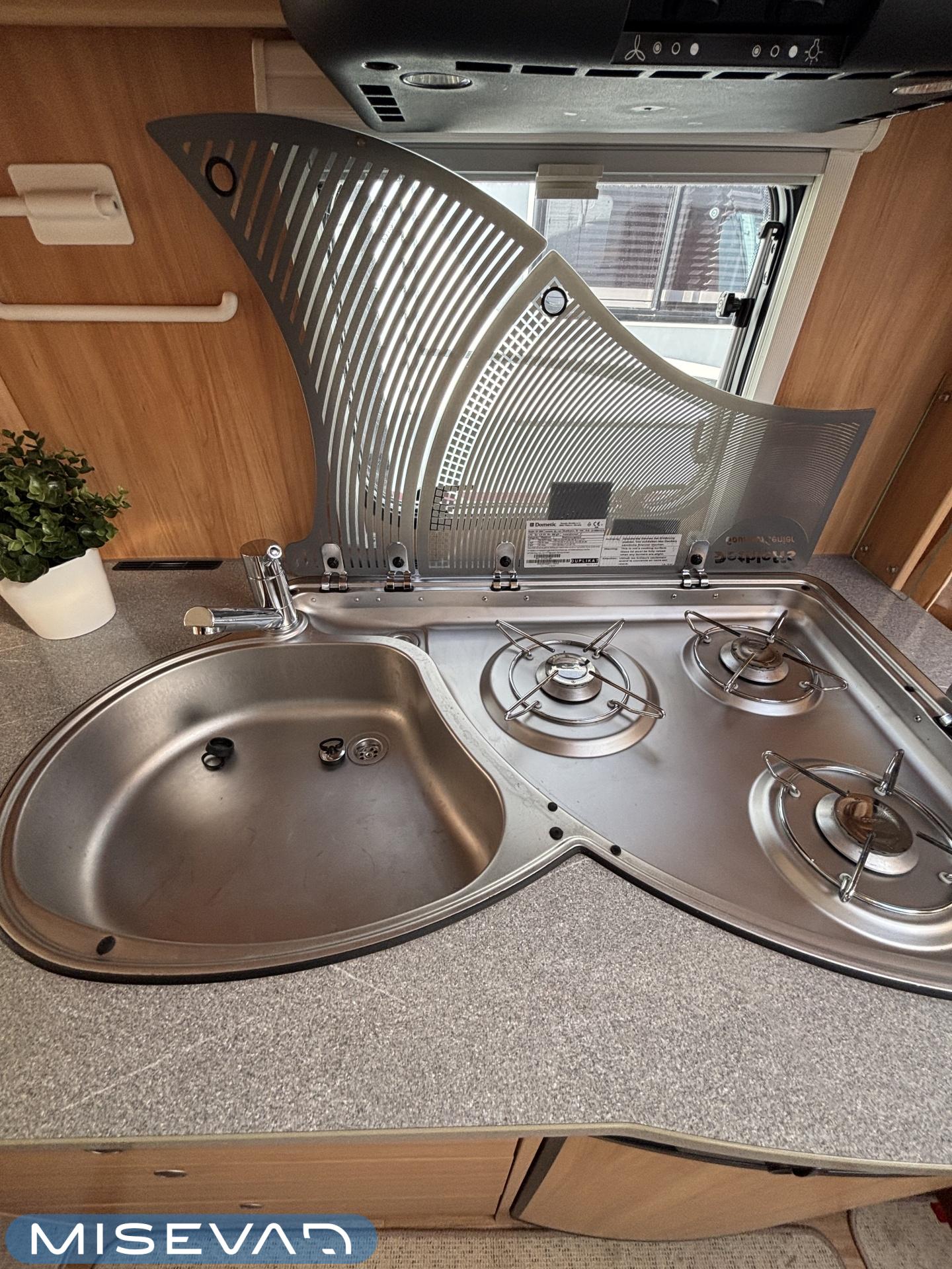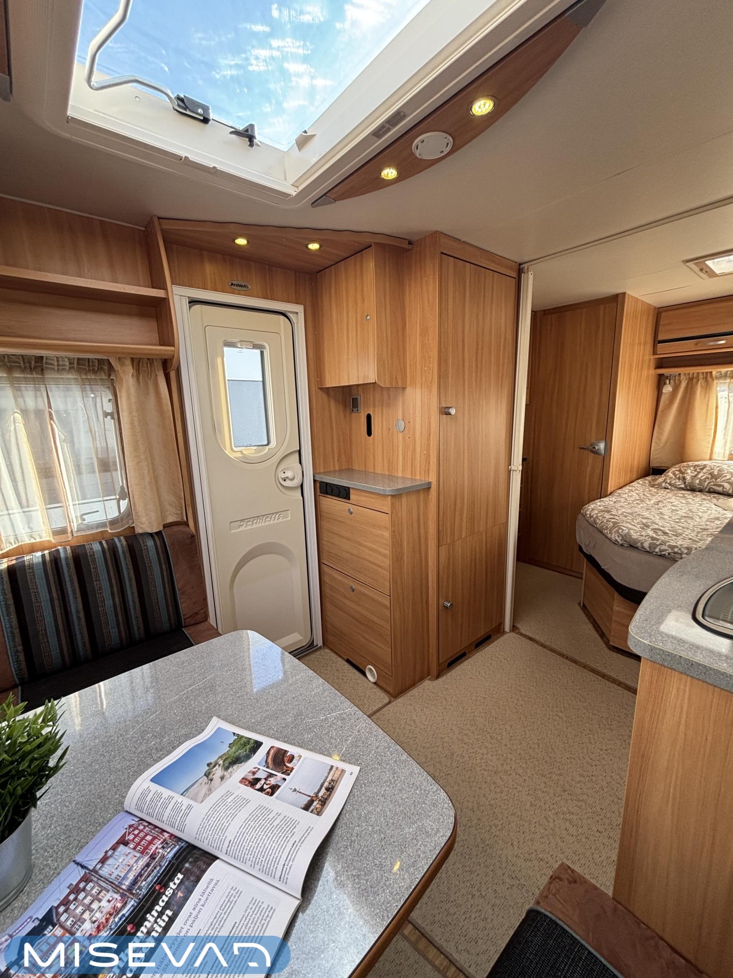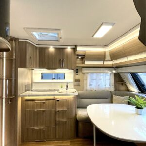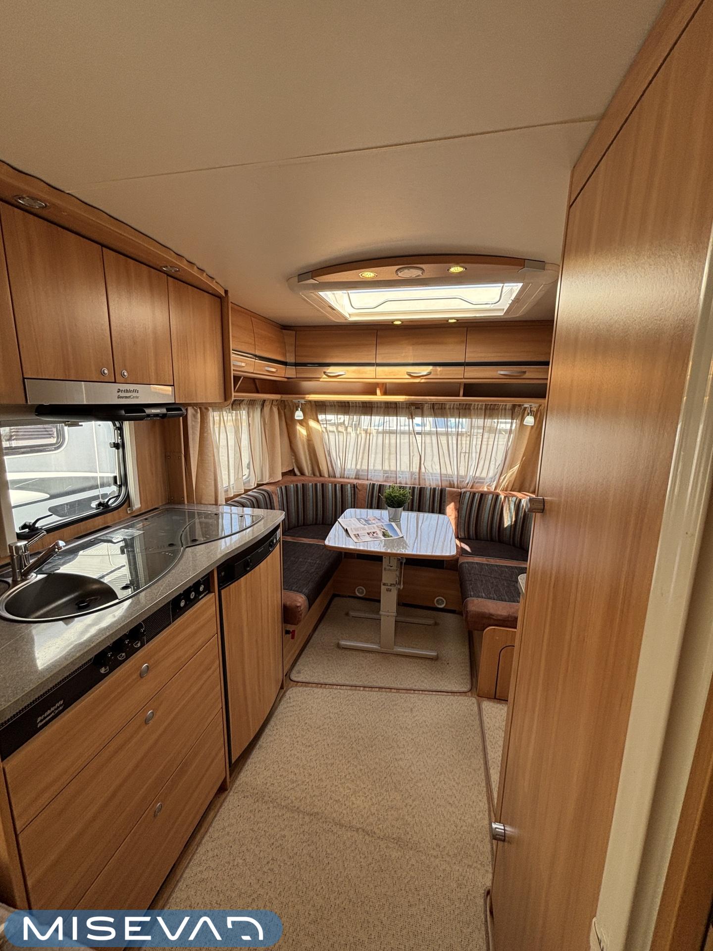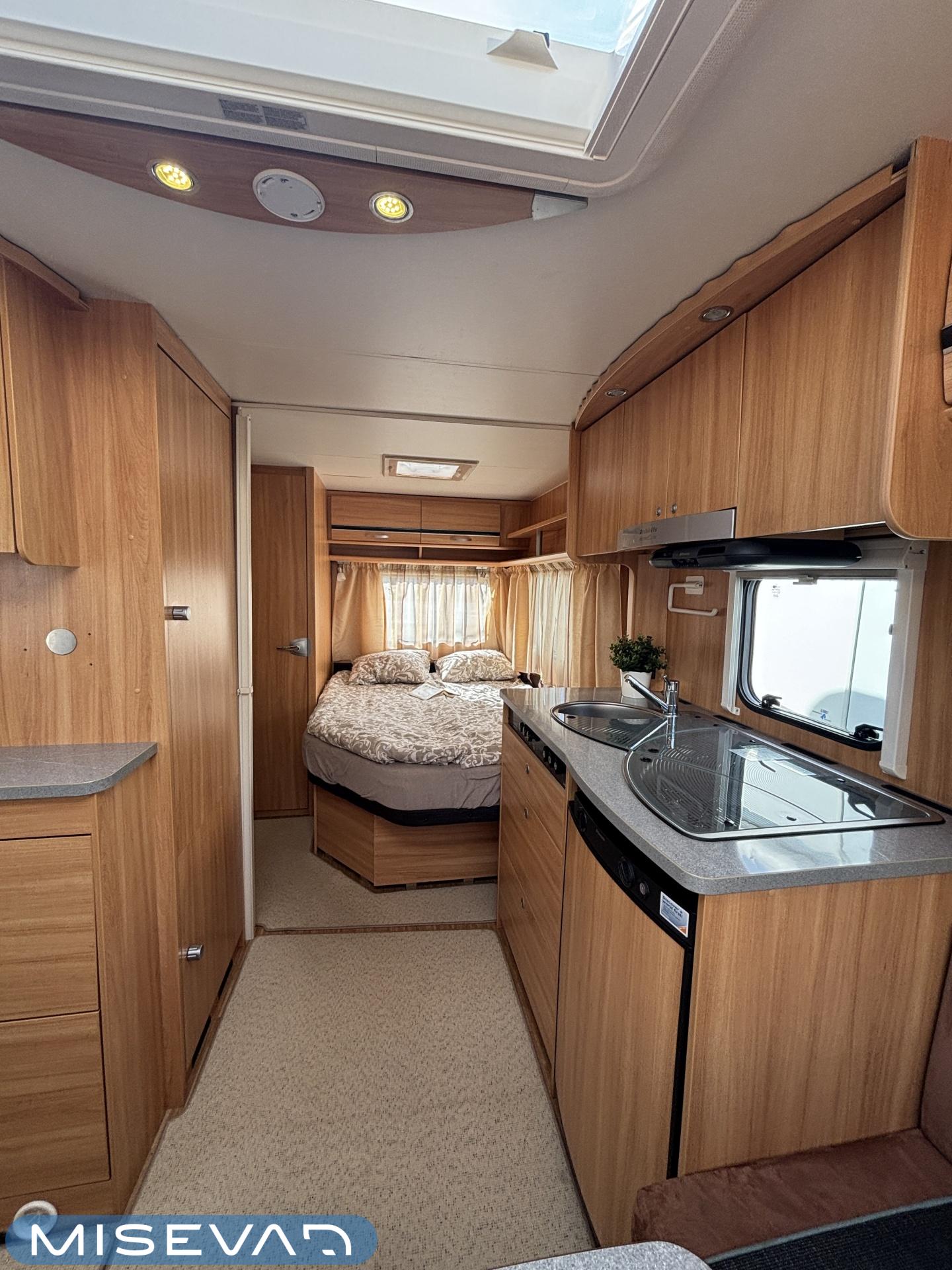 Vaunussa on leveä kolmitoimijääkaappi pakastelokerolla ja reilusti säilytystilaa, tilavat yläkaapistot kiertävät koko vaunun ympäri ja keittiötä vastapäätä majailee iso henkarikaappi päällysvaatteille. Wc/suihkutila sijatsee henkarikaappia vastapäätä. Tässäkin huoneessa on luonnonvaloa tarjoava kattoluukku olo- ja makuutilan tapaan.