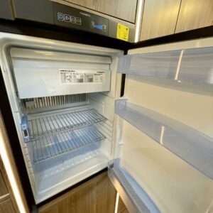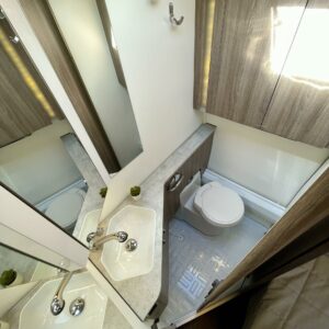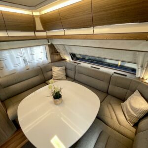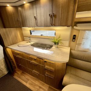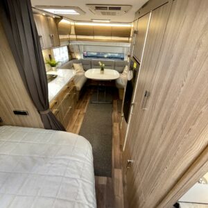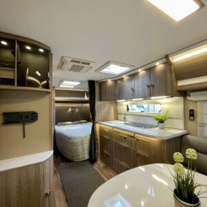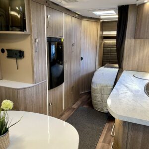 Sisustuksessa pehmeät ja tyylikkäät värisävyt kankaissa sekä puumateriaaleissa luovat viihtyisän tunnelman. Käytännöllinen keittiö, jossa jääkaappi on sopivalla korkeudella ilman turhaa kyykistelyä, sekä runsaasti laskutilaa helpottavat arkea matkalla.