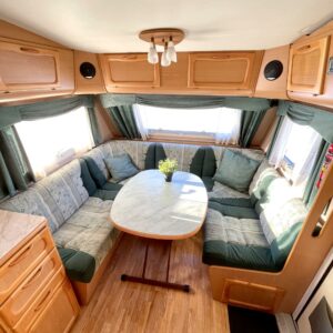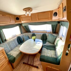 Kevyt ja lämmin Kabe-vaunu parivuoteella ja isolla U-ryhmällä.