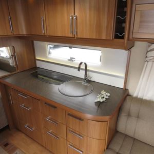 jääkaappi ja isot komerot, edessä U-ryhmä josta iso parivuode. Runsas vakiovarustelu. Talvivaunujen King.