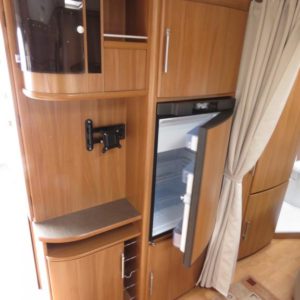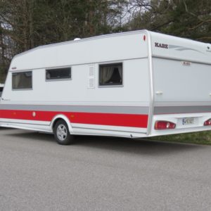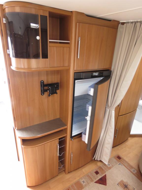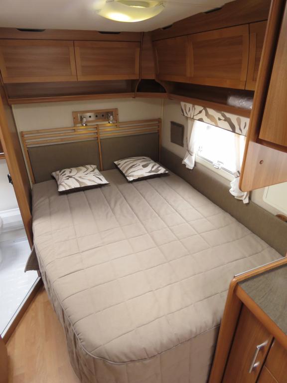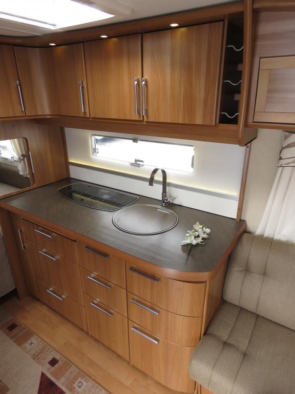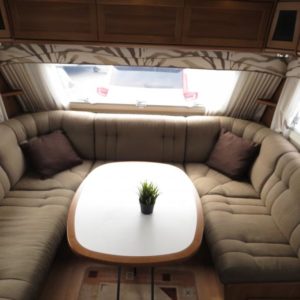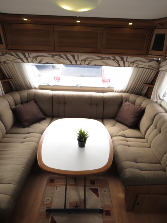 jääkaappi ja isot komerot, edessä U-ryhmä josta iso parivuode. Runsas vakiovarustelu. Talvivaunujen King.