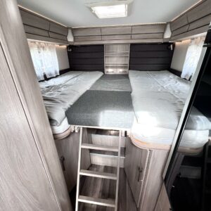 Uudehko automaattivaihteinen matka-auto erillisvuoteilla ja suurella tallilla.