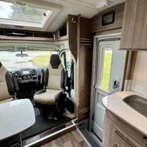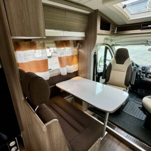 Lähes 7,5 m kokonaispituus mahdollistaa hulppeat sisätilat. Auton etuosassa on pöytäryhmä neljälle. Muutama askel kohti takapäätä vie kulkijan keittiöön, jonka varustukseen kuuluu ison jääkaappi- pakastimen lisäksi mikroaaltouuni ja liesituuletin.