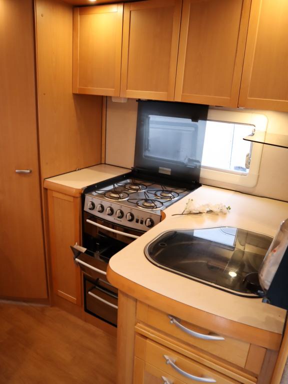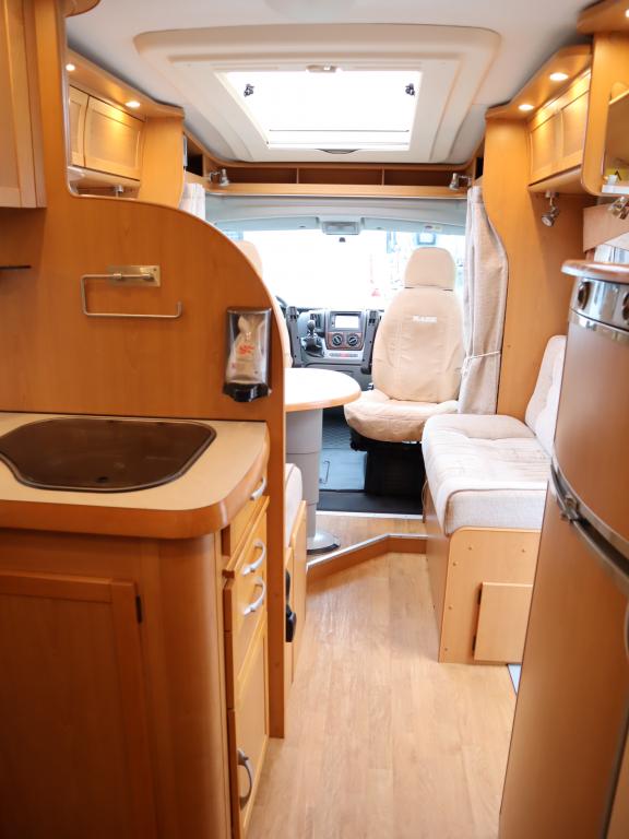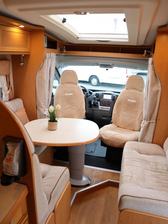 Takana parivuode pitkittäin ja tilava pesuhuone, keskellä keittiö jossa mm uuni ja iso jääkaappi, edessä oleskeluryhmä 6:lle kääntyvin ohjaamon penkein.