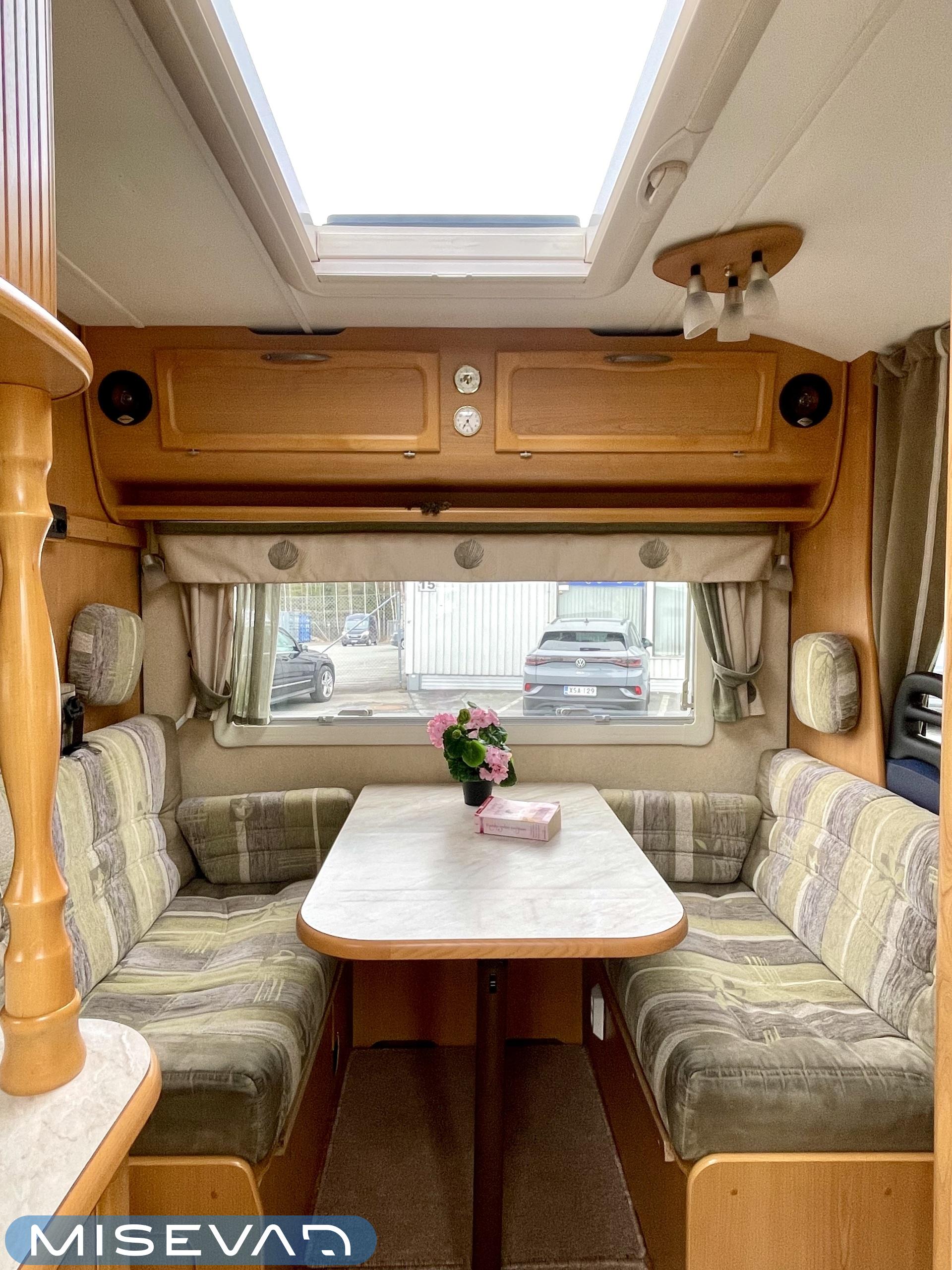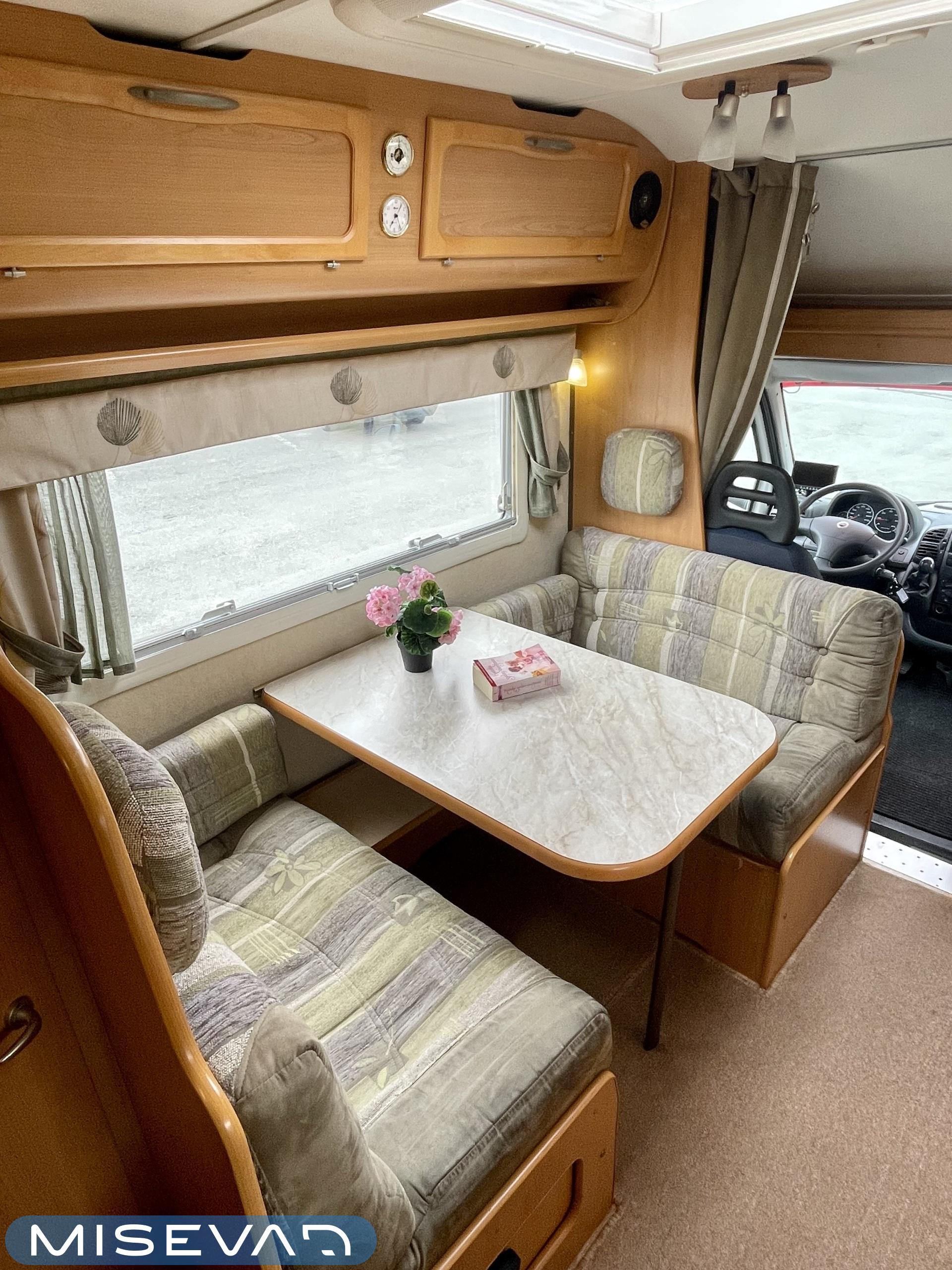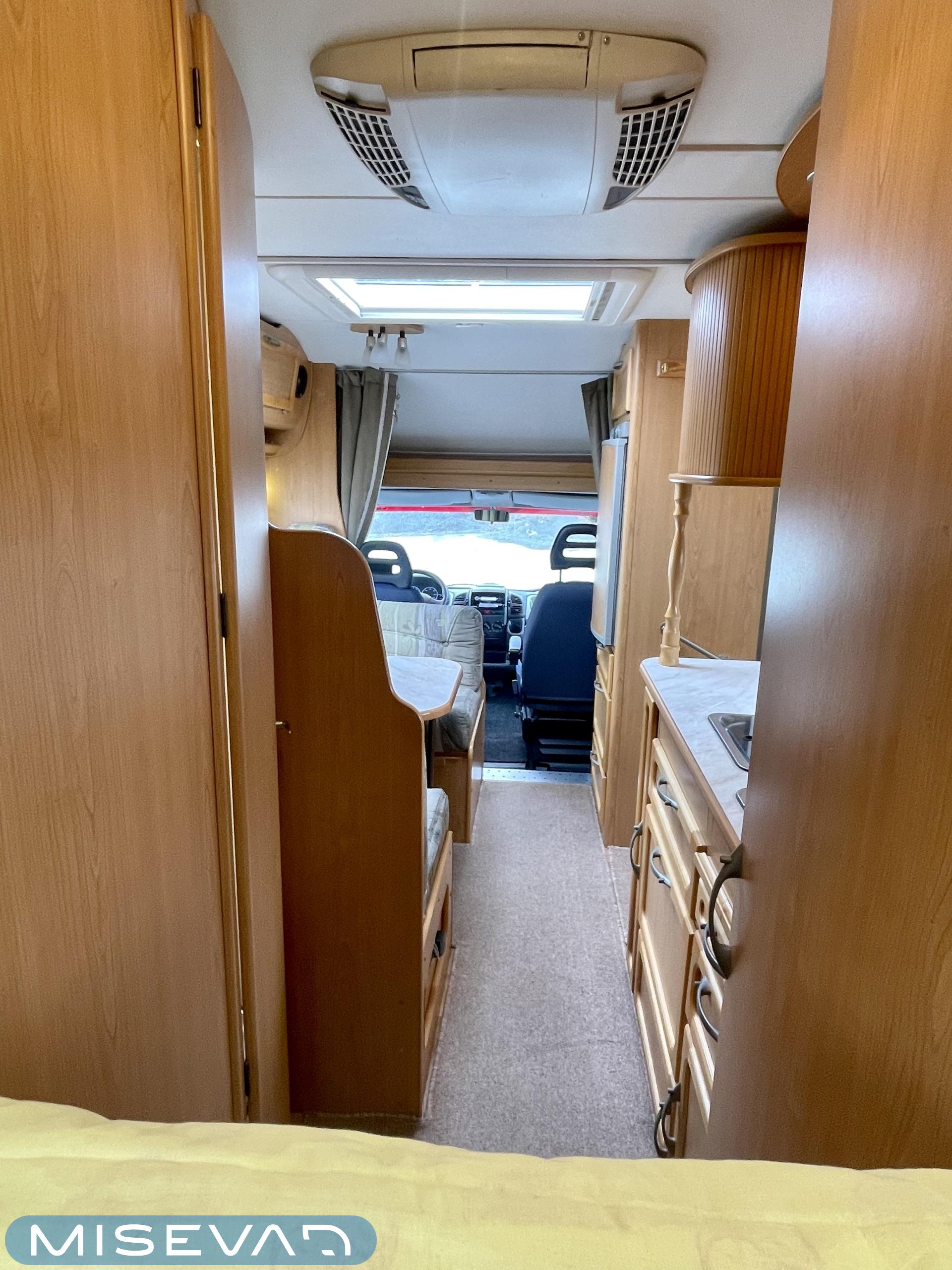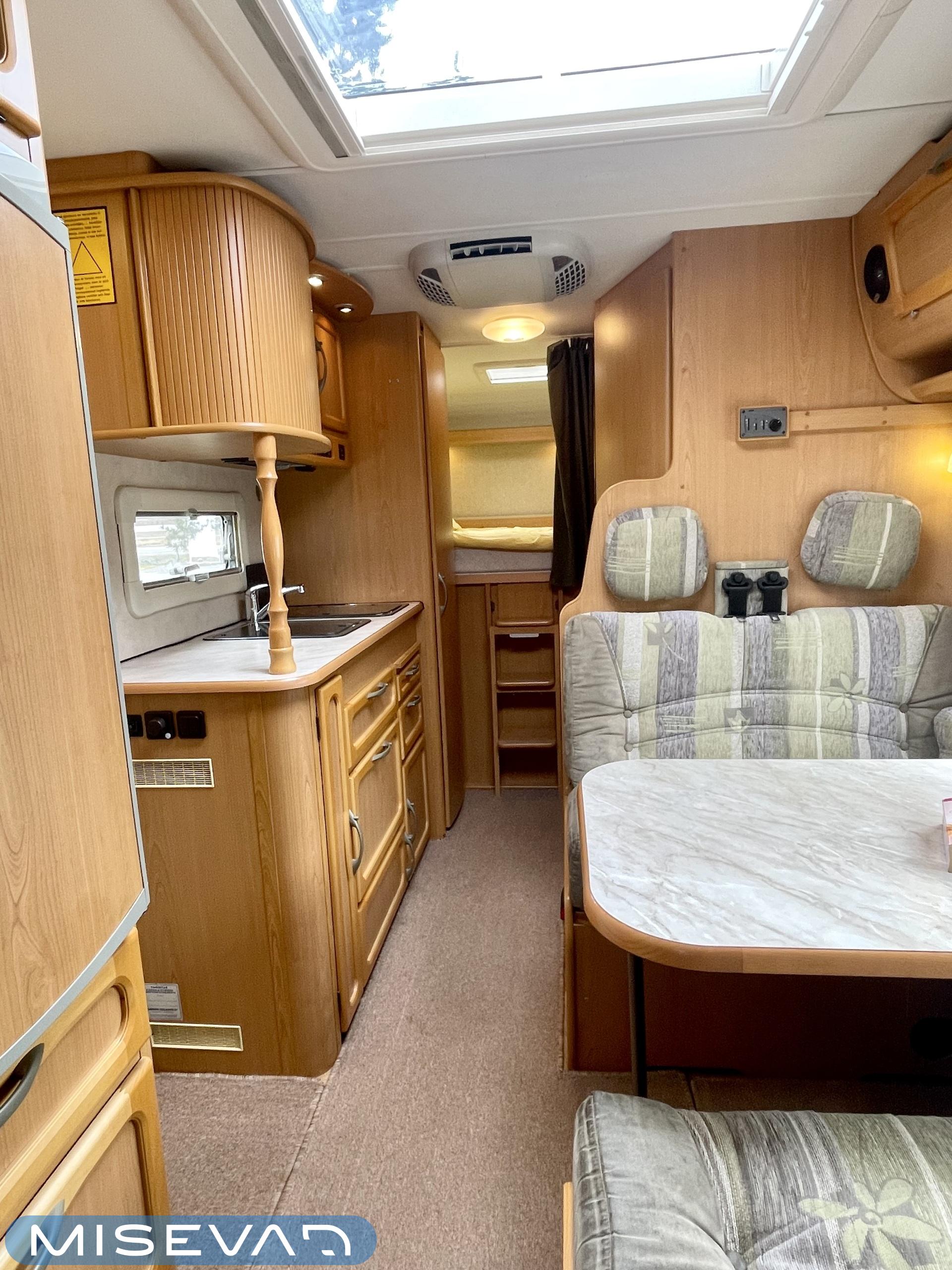 CD-soitin, Erikoisvanteet, Jääkaappi, Kasetti WC, Kasettiverhot, Kattoluukku, Keskuslämmitys, Liesi, Lämminvesiboileri, Markiisi, Nestekiertolämmitys, Ohjaustehostin, Pakastelokero, Parivuode, Pesuallas, Polttoainekäyttöinen lisälämmitin, Radio, Suihku, Sisätilanpistoke, Sähköpatruuna, Alde, Lattialämmitys (nestekierto), Ilmastointi (asuintila), Webasto/Eber, Kesärenkaat, 1 x kevytmet.vanteet, kwh-mittari, astinlaudat, kaasun ulosotto
