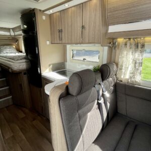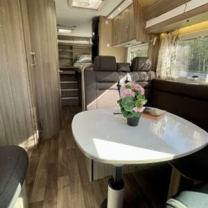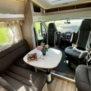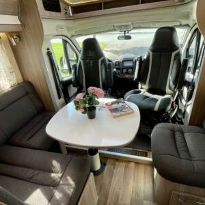 Auton etuosassa on viihtyisä L- sohvaryhmä lyhyellä sivusohvalla. Etuosan panoraamaikkkuna tuo luonnonvalon mukavasti sisään. Pimeämpiä vuorokaudenaikoja varten autosta löytyy monipuolinen sisävalaistus.