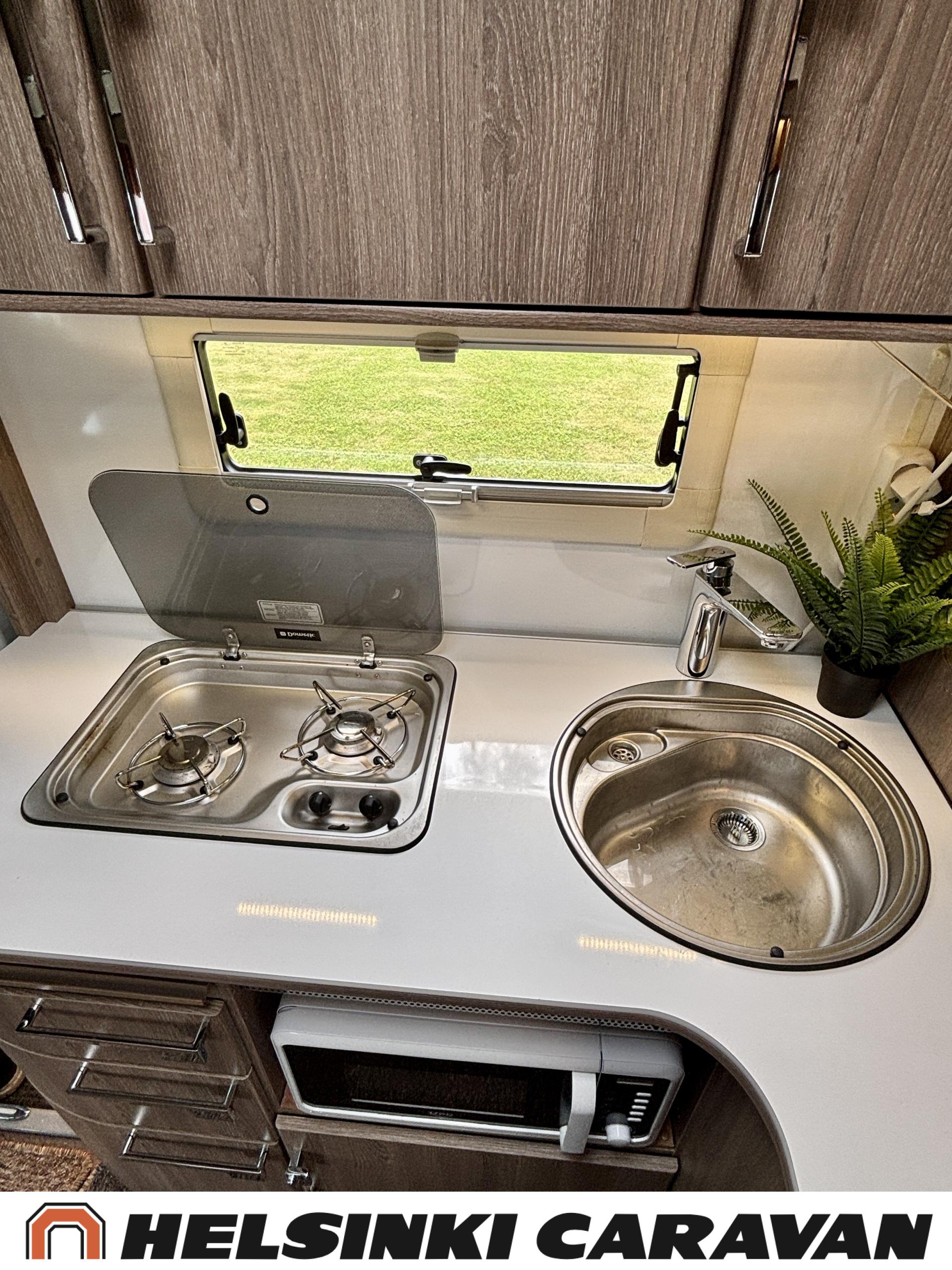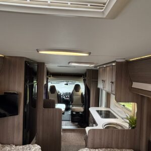 Auton etuosassa on viihtyisä pöytäryhmä neljälle. Keskivaiheilla sijaitsee keittiösaareke, jonka varustukseen kuuluu kaasulieden lisäksi mikroaaltouuni ja iso jääkaappi erillisellä pakastinlokerolla.