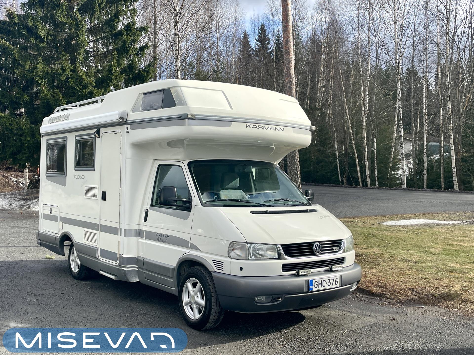 Todella upea Karmanni Volkkarin teenelkku alustalla ja mukavasti vetävällä 2.5 litraisella TDI moottorilla. Tämä on niitä sarjassamme hieman harvemmin tarjolla olevia tuotteita. Auton takaosassa on tilava U-ryhmä mistä saadaan kädenkäänteessä sijattua vuode kahdelle henkilölle. Vuoteen alle jää säilytystiloja minne on pääsy ulkopuolisen luukun kautta. Keskeltä autoa löytyy keittiö normaalilla matkailuauton keittiövarustuksella. Etuosassa on WC/kylpyhuonetilat. Ohjaamon päällä on alkovivuode kahdelle. Lämmitysjärjestelmänä on Trumaticin ilmakeskuslämmitys ja samassa lämmitinyksikössä on myös lämminvesiboileri. Ohjaamovarusteista mainittakoon vakionopeuden säädin, ilmastointi, sekä lasit ja peilit sähkökäyttöisinä. Löytyyhän autosta vielä valmiiksi asennettuna markiisi, sekä vetokoukku. Koukulle on annettu vetomassat 1200kg jarrullisena ja 700kg jarruttomana. Tämähän toimittaa hienosti vaikka tila-auton virkaa, koska viralliset matkustuspaikat löytyy kuudelle henkilölle. Auto tullut Suomeen 2006 (Saksa) missä se oli ensimmäisen vuoden yksityishenkilön käytössä. Auto vaihtoi omistajaa 5/2007 ja sen jälkeen auto on ollut yhden ja saman omistajan hellässä huomassa. Keräilyharvinaisuus selkeästi kyseessä … kuka kerkeää ekana?