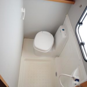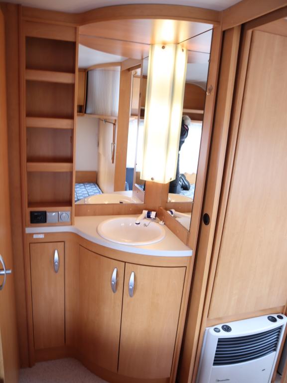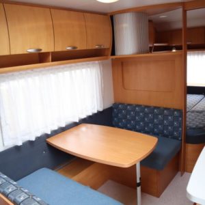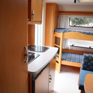 Vaunun takaosassa kerrosvuoteet, edessä pitkittäinen parivuode ja pesuhuone/ WC. Vaunun keskeltä löytyy pöytäryhmä joka sijattavissa toiseksi parivuoteeksi.