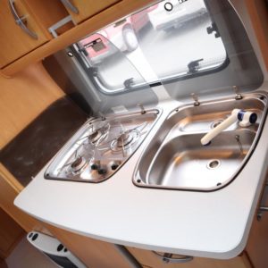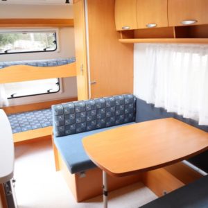 Vaunun takaosassa kerrosvuoteet, edessä pitkittäinen parivuode ja pesuhuone/ WC. Vaunun keskeltä löytyy pöytäryhmä joka sijattavissa toiseksi parivuoteeksi.
