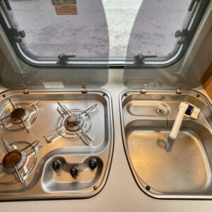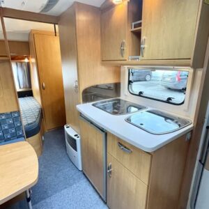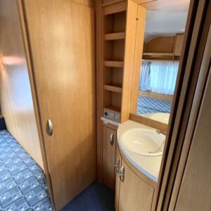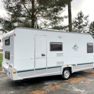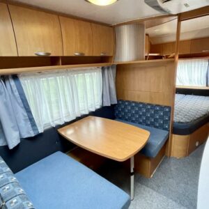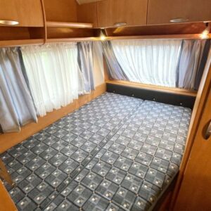 Pohjaratkaisussa takaosassa kerrosvuoteet. Keskiosassa sohvaryhmä joka pedattavissa lisävuoteeksi sekä keittiö. Etuosassa pitkittäinen parivuode sekä Wc & Suihkutila.