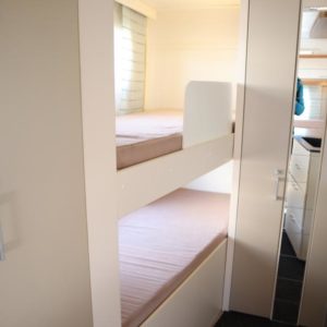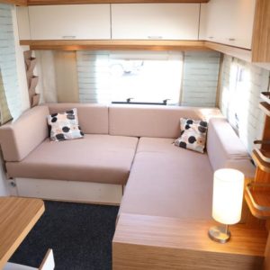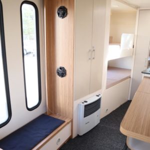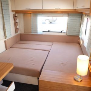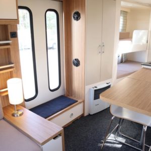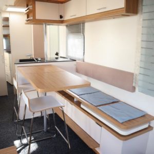 Vaunun takaosassa hulppea vuodesohva joka muuntuu todella leveäksi parivuoteeksi kädenkäänteessä. Vaunun keskivaiheilta löytyy baaripöytä jonka ympärille mahtuu mukavasti 5 -6 henkeä. Vaunun etuosasta löytyy kerrosvuoteiden lisäksi WC ja keraamisella kaasuliedellä varustettu keittiö.
