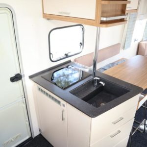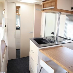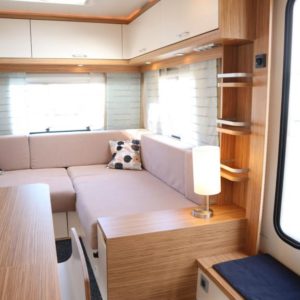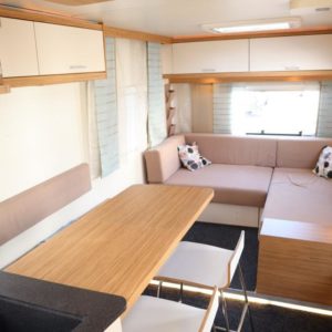 Vaunun takaosassa hulppea vuodesohva joka muuntuu todella leveäksi parivuoteeksi kädenkäänteessä. Vaunun keskivaiheilta löytyy baaripöytä jonka ympärille mahtuu mukavasti 5 -6 henkeä. Vaunun etuosasta löytyy kerrosvuoteiden lisäksi WC ja keraamisella kaasuliedellä varustettu keittiö.