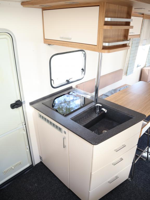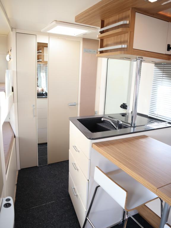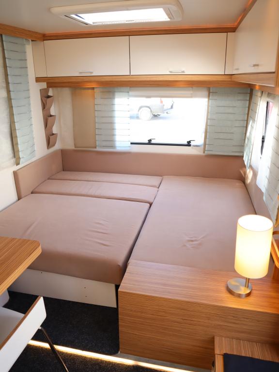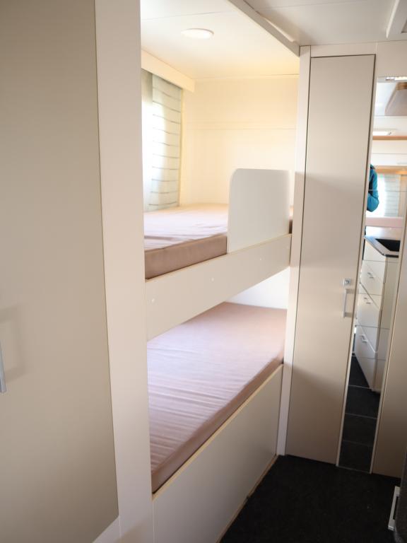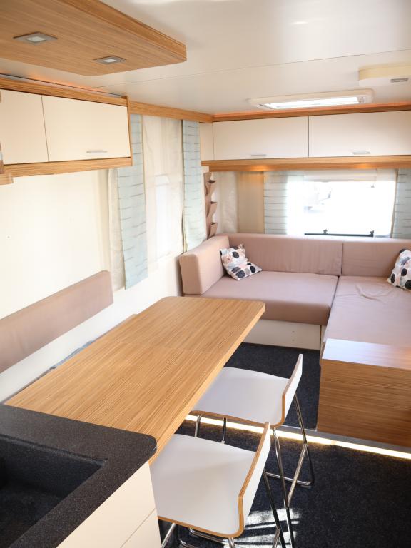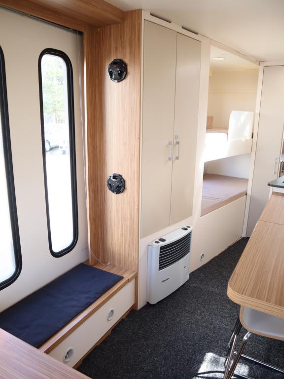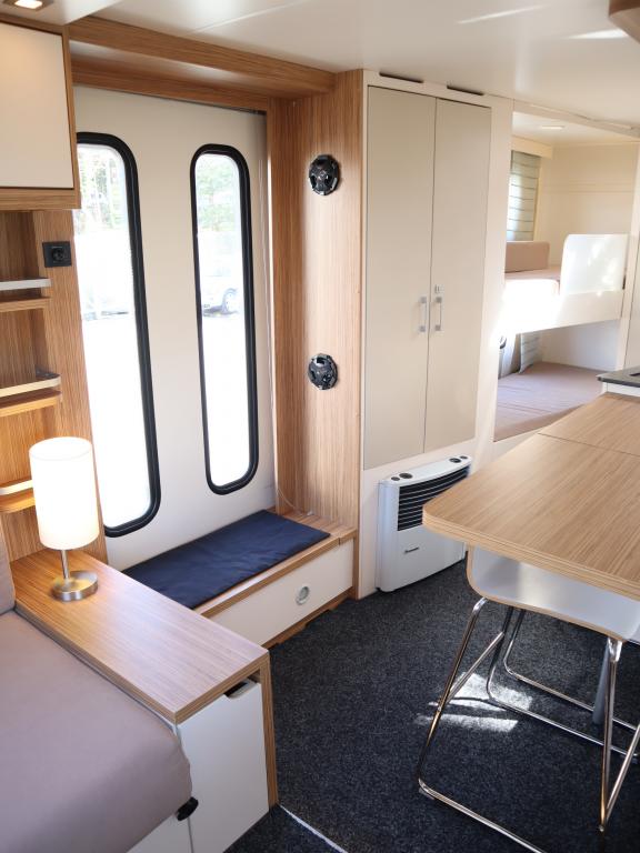 Vaunun takaosassa hulppea vuodesohva joka muuntuu todella leveäksi parivuoteeksi kädenkäänteessä. Vaunun keskivaiheilta löytyy baaripöytä jonka ympärille mahtuu mukavasti 5 -6 henkeä. Vaunun etuosasta löytyy kerrosvuoteiden lisäksi WC ja keraamisella kaasuliedellä varustettu keittiö.