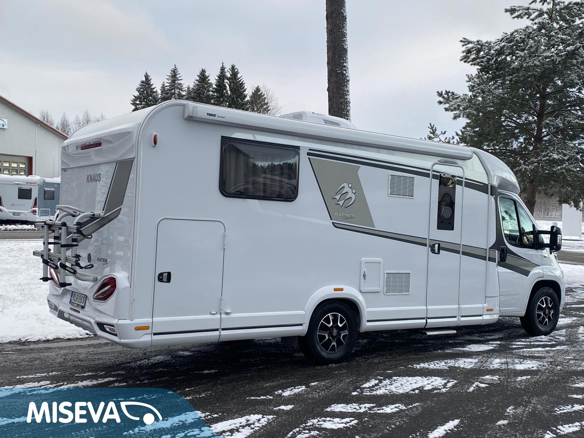 Aika hieno ja mahtavasti varusteltu Knaussin ”puoli-inkkari”! Tästähän löytyy vähän yhtä sun toista, katso lista eriteltynä tämän esittelytekstin jälkeen. Auton takaosa on pyhitetty makuuhuone/kylpyhuone osioksi. Sieltä löytyy saarekevuode minkä molemmilta puolilla on vaatekaapit ja säilytystiloja. Tämän vuodekompleksin alle jää läpilastattava takatalli mikä tarjoaa hyvät säilytystilat reissussa mukana kulkeville tarvikkeille. Suihku on omana erillisenä tilanaan ja WC:n ovella voidaan ”rauhoittaa” auton takaosa omaksi tilakseen. Keskellä on L-keittiö mistä löytyy mm. iso jääkaappi. Etuosaa hallitsee pöytäryhmä minne yhdistyvät ohjaamon kapteenin penkit, sekä sivupenkki. Kaksi isoa kattoikkunaa antaa luonnonvalon suorastaan tulvia sisätiloihin. Lämmitysjärjestelmänä Alden nestekiertolämmitys ja tietysti sähkövastuksilla (sähköpatruuna) varustettuna. Aapukuljettajan penkin alla on vielä erillinen ”booster” lämmitin antamaan lisälämpöä ohjaamon puolelle. Ilmastoinnit löytyy niin tuvan, kun ohjaamonkin puolelta. Matka taittuu leppoisasti, kun 9-vaihteinen automaatti valitsee omatoimisesti oikeat välitykset ja vakkari pitää vauhdin vakaana. Nopeutta voi seurailla HUD-näytöltä. Pioneerin multimediasoitin hoitaa ääniviihteen lisäksi myös navin, sekä peruutuskameran virkaa. On magia … ei tähän oikein muuta voi sanoa. Tulkaa tutustumaan paikan päälle.