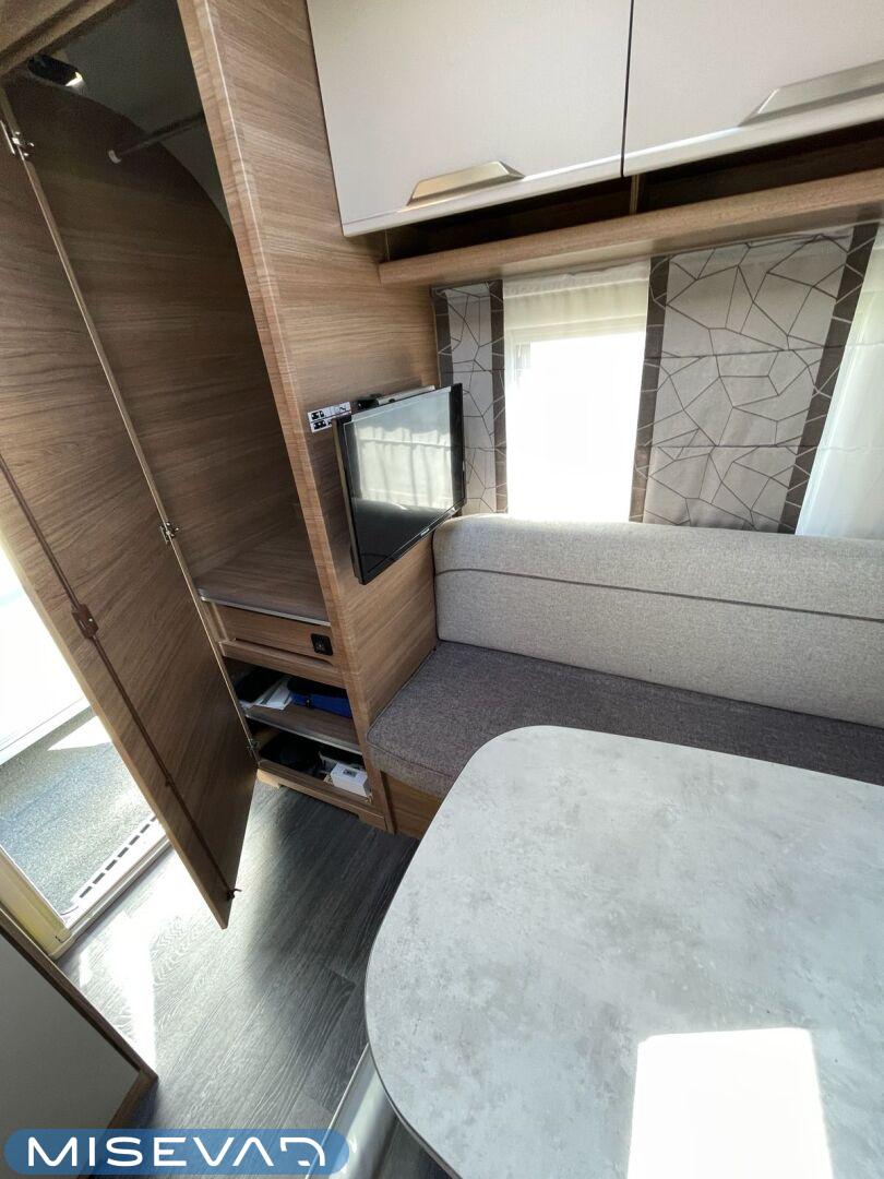 Trumatic- ilmapuhalluslämmitys, Markiisi, Erikoisvanteet, Jääkaappi, Kasetti WC, Kasettiverhot, Kattoluukku, Liesi, Lämminvesiboileri, Pakastelokero, Parivuode, Pesuallas, Suihku, Sähköpatruuna, Tukijalat, Äänentoistojärjestelmä, Lattialämmitys (sähkö), Tupla-akut, kwh-mittari, sähkön ulosotto, televisio, televisioteline, Asuinosan hyttysovi/verho, Pussimarkiisi, Bluetooth
