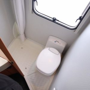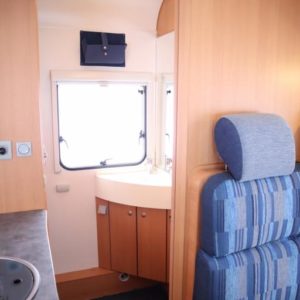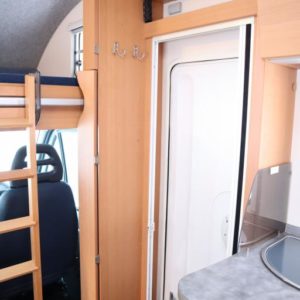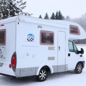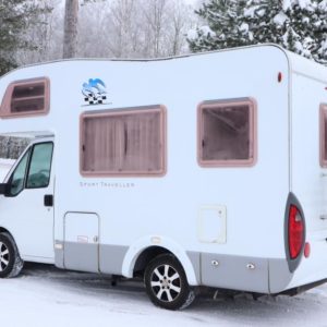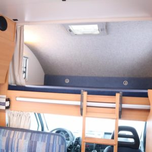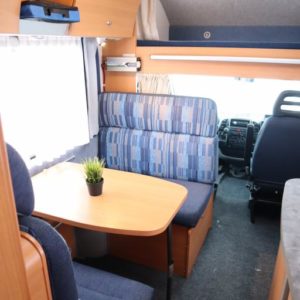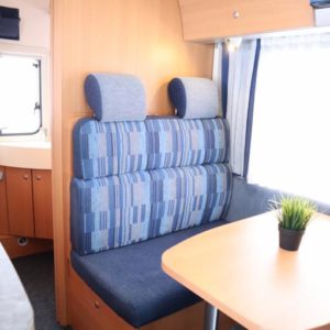 Auton takaosassa WC/ pesuhuone ja säilytystilaa, edessä leveä alkovivuode. Toinen parivuode sijattavissa pöytäryhmästä.