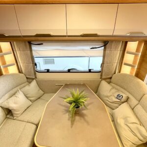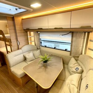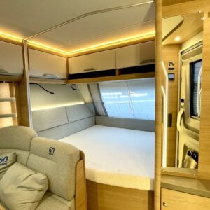 Sisään astuessa laadukas tunnelma säilyy, upea epäsuora ledvalaistus ja laadukkaat materiaalit suorastaan kutsuvat peremmälle. Vaunun edessä on 145cm leveä ranskalaistyylinen parivuode, keskiosan sohvaryhmästä saa tarvittaessa makuusijan kahdelle ja takaosasta löytyy kaksikerroksinen kerrossänky. Tässä vaunussa majoittuu siis tarvittaessa kuusi henkilöä kerrallaan!