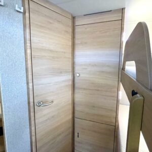 Vaunu takana kerrossänkyjä vastapäätä on suuri wc/kylpyhuone suihkuineen ja peilikaapistoineen.