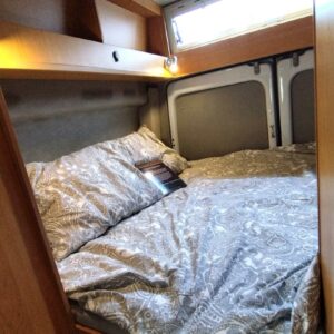 Takana poikittainen parivuode minkä alapuolella säilytystilaa tavaroille. Keskellä näppärän kokoinen keittiö perusvarusteineen, sekä yllättävänkin tilavat WC/kylpyhuonetilat. Edessä pöytäryhmä minne yhdistyy kääntyvät ohjaamon penkit.