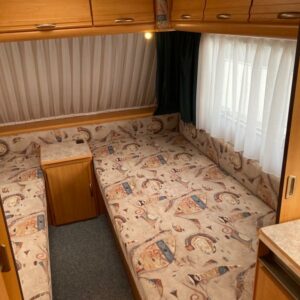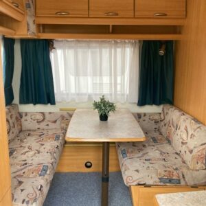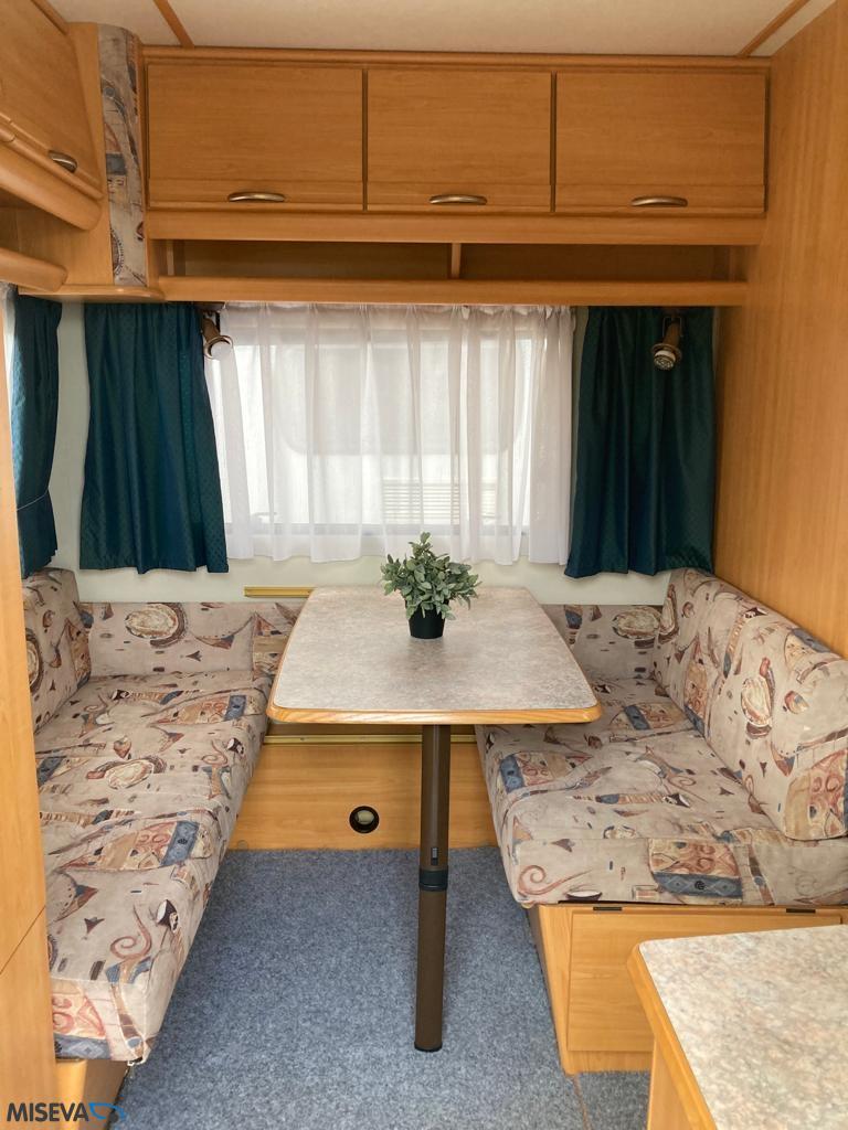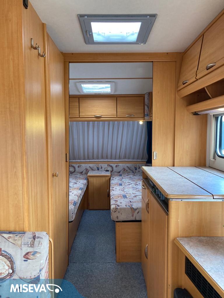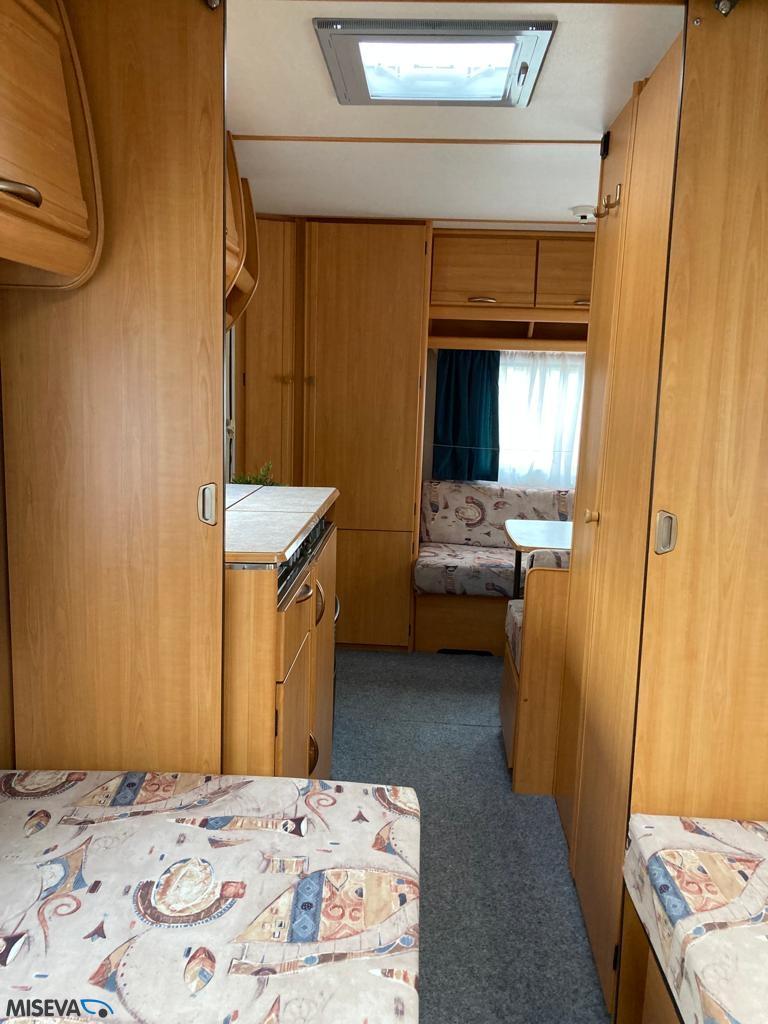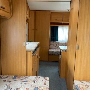 Pohjaratkaisussa takana sohvaryhmä. Keskiosassa keittiö sekä wctila. Etuosassa erillisvuoteet sekä kaappitilaa.