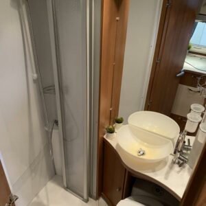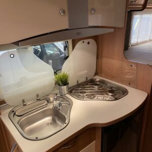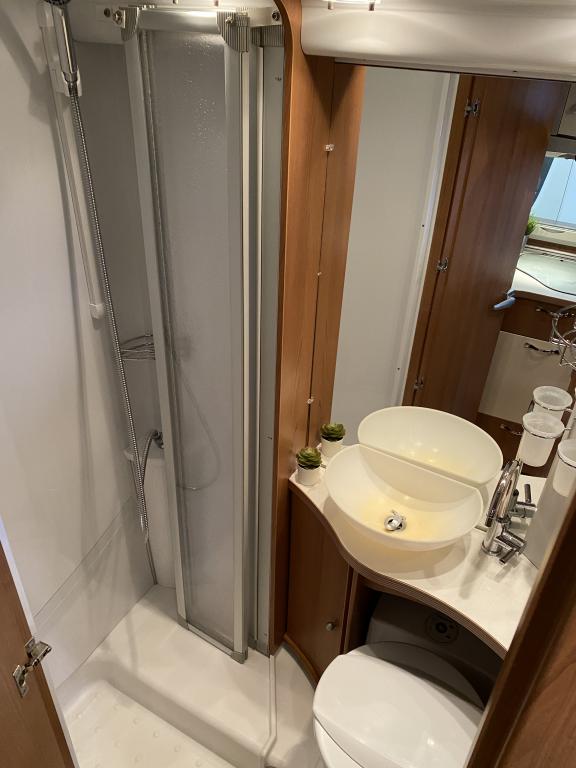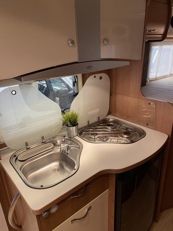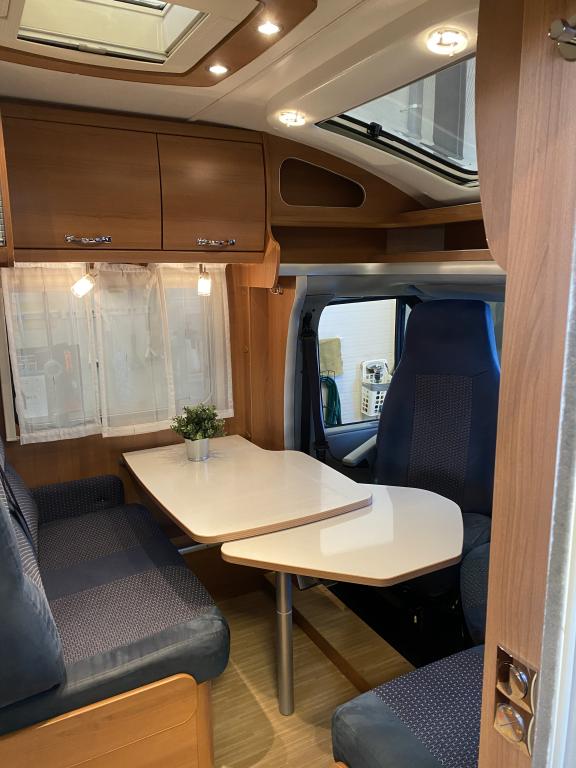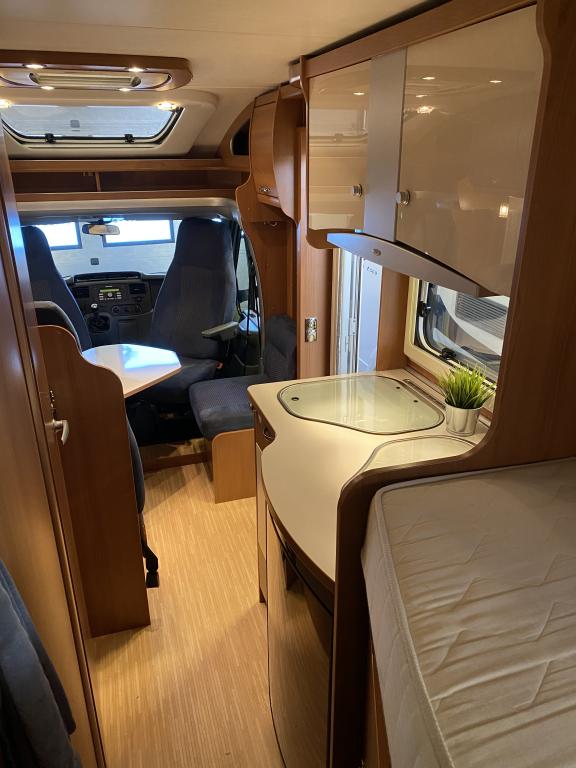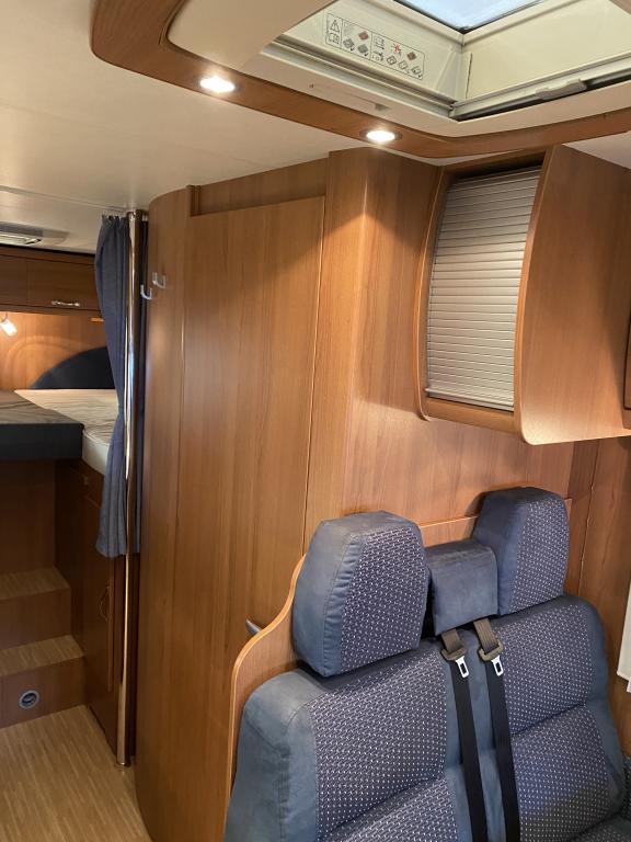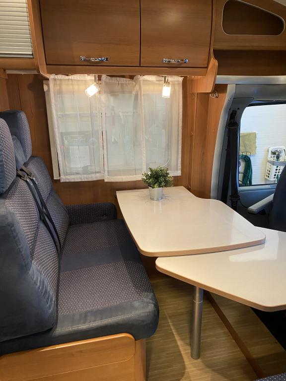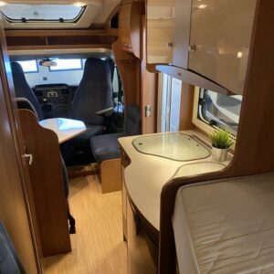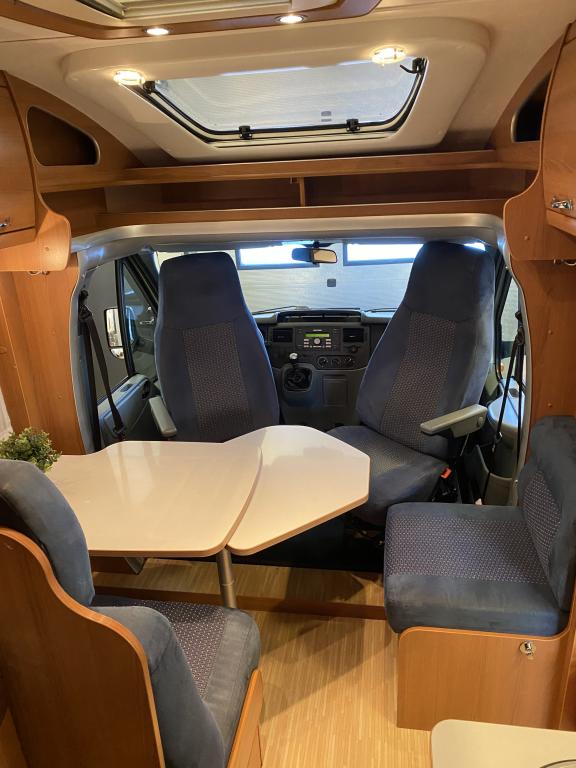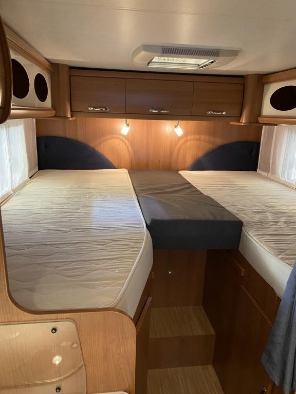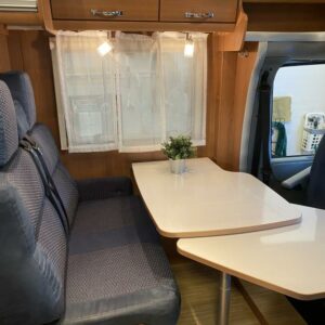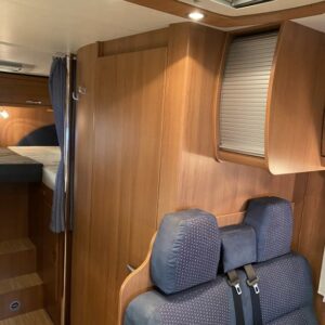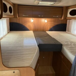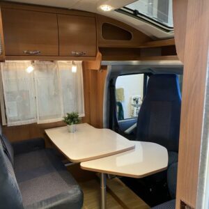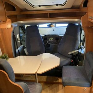 Takana erillisvuoteet jotka myös yhdistettävissä ja alla iso tallitila, keskellä pesuhuone ja keittiö, edessä istuinryhmä 5:lle kääntyvin ohjaamon penkein josta myös vuode yhdelle.