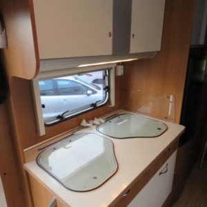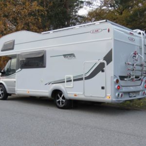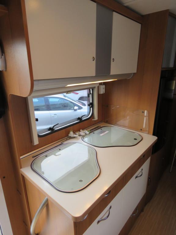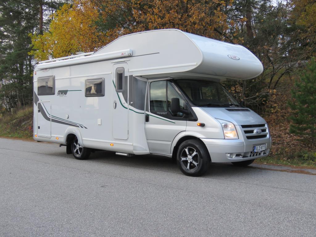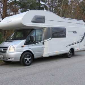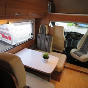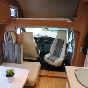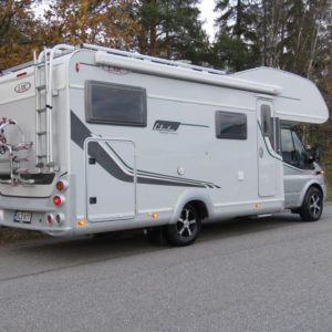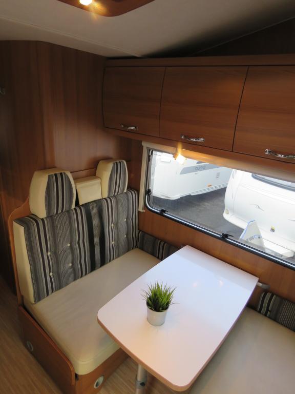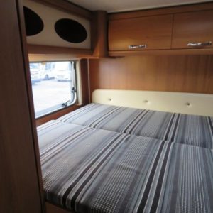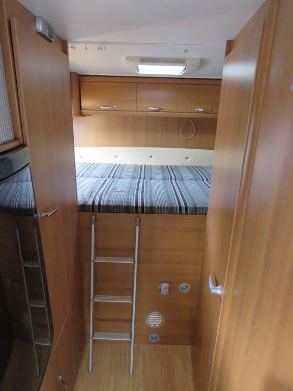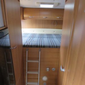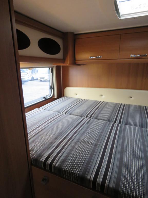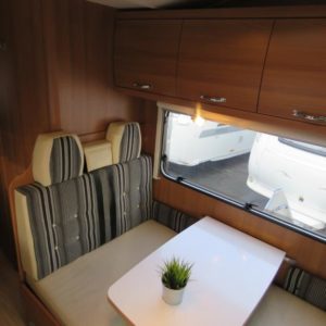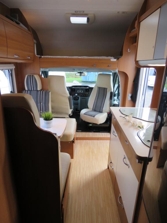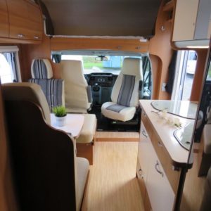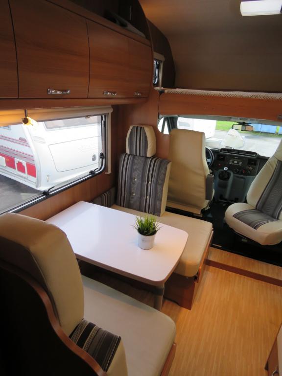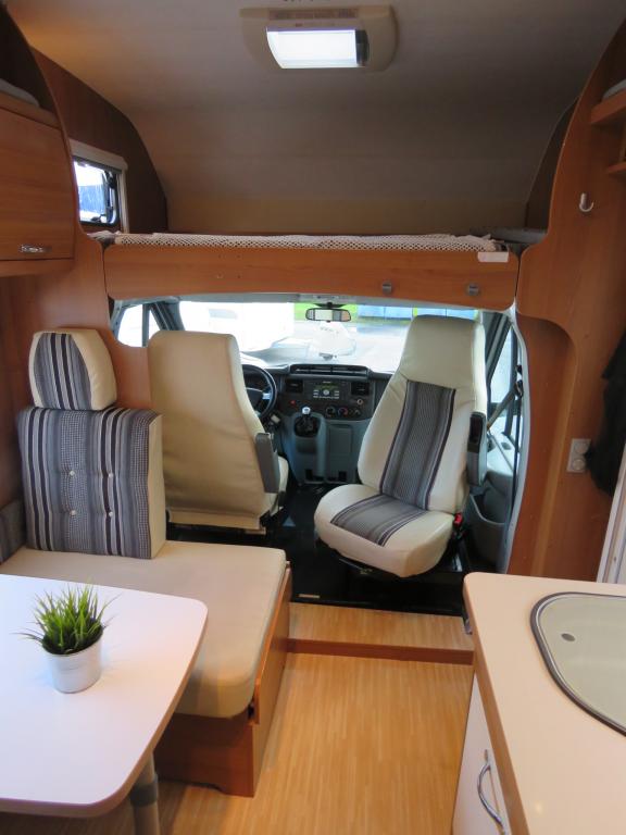 Takana parivuode,keskellä tilava pesuhuone ja keittiö, edessä istuinryhmä 4:lle josta parivuode, ohjaamon päällä alkovivuode. Rekisteröity ja makuutilat 6:lle.