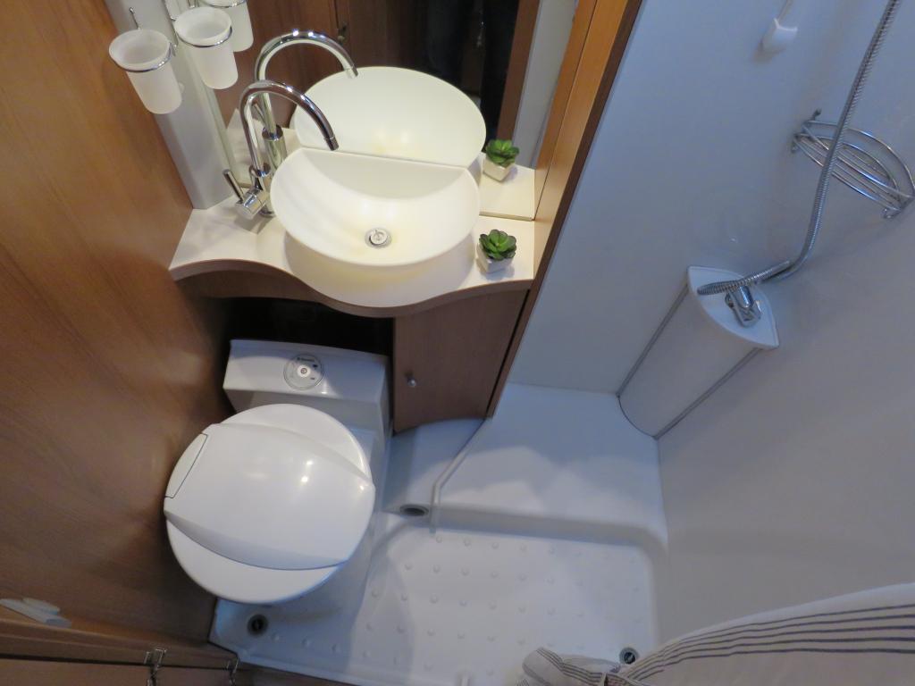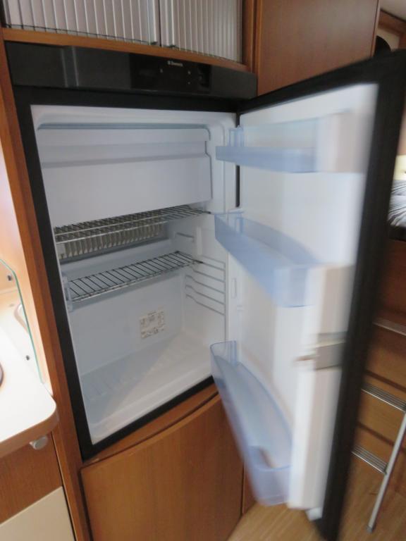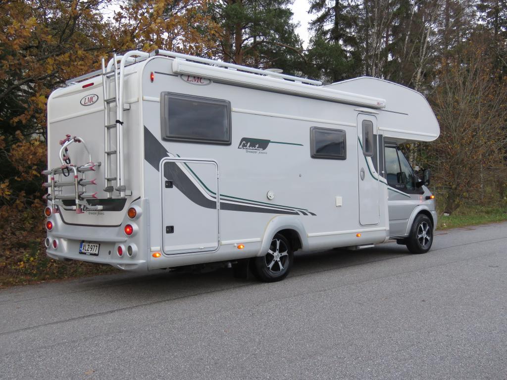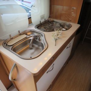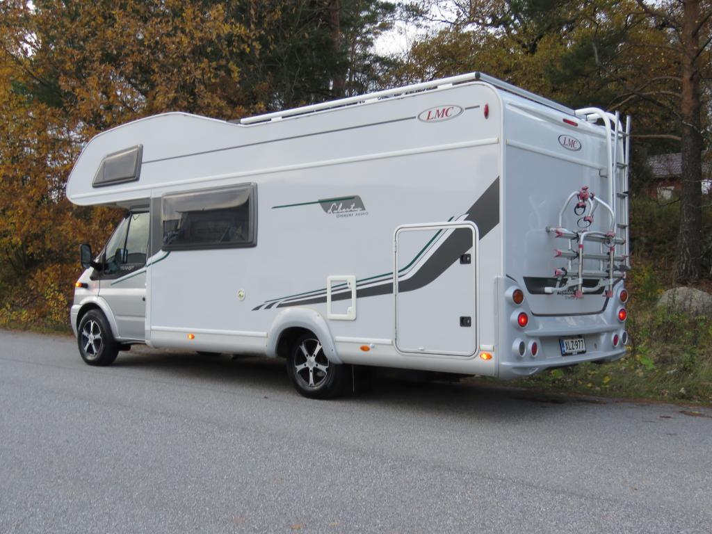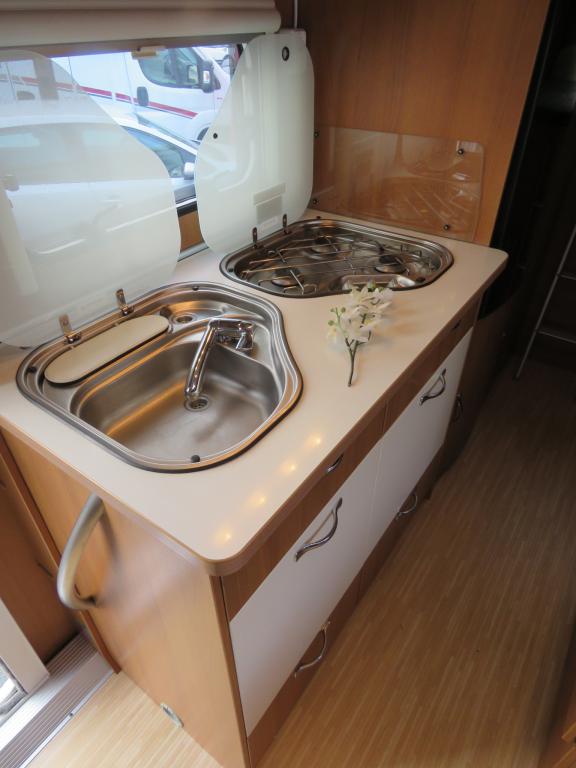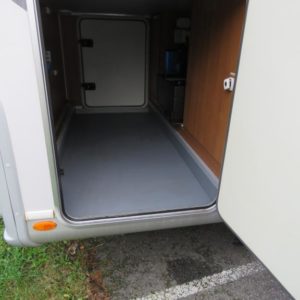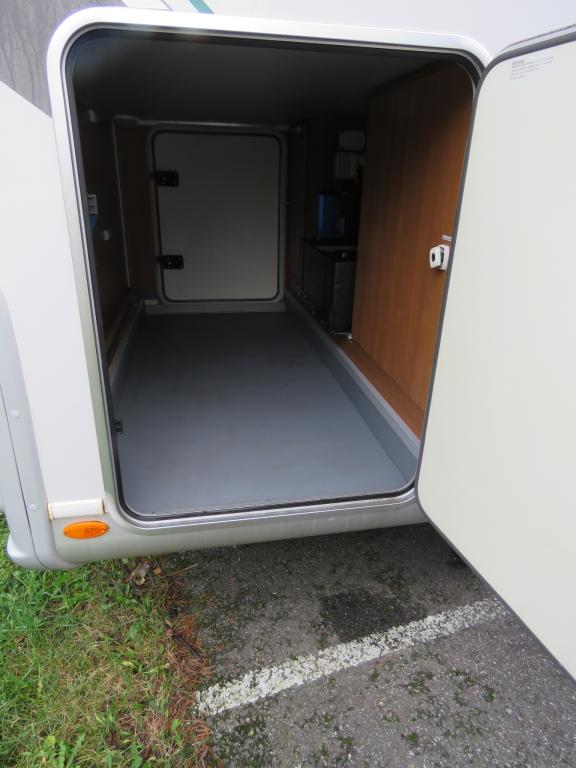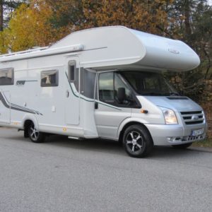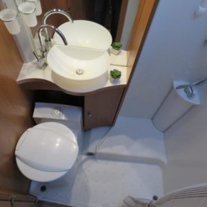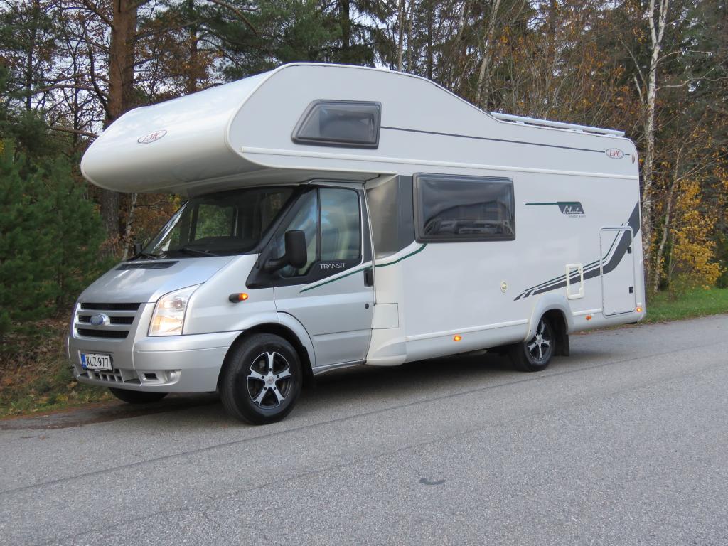 Takana parivuode,keskellä tilava pesuhuone ja keittiö, edessä istuinryhmä 4:lle josta parivuode, ohjaamon päällä alkovivuode. Rekisteröity ja makuutilat 6:lle.