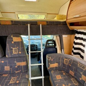 Auton etuosasta löytyy leveän alkovivuoteen lisäksi pöytäryhmä, jonka ympärille mahtuu jopa 7 henkeä toisiaan hauskuuttamaan. Pöytäryhmästä saa tarvittaessa sijattua toisen parivuoteen.