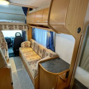Erittäin avara pohjaratkaisu: Auton takaosassa on keittiö ja pesuhuone/ WC. Etuosasta löytyy leveä alkovuode ja pöytäryhmä pitkällä sivusohvalla.