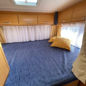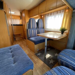 Edessä avara pöytäryhmä 6:lle, keskellä L- keittiö, ylös nostettu jääkaappi ja hyvin säilytystilaa sekä erillinen WC. Takana poikittainen parivuode, jonka alla valtava takatalli.