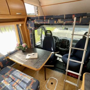 Etuosasta löytyy leveän alkovivuoteen lisäksi pöytäryhmä neljälle.