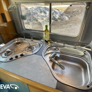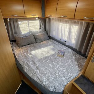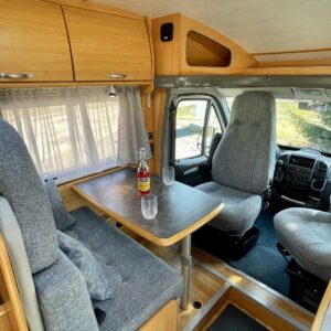 Takana pitkittäinen parivuode, sekä WC/kylpyhuonetilat. Keskellä säilytystiloja. Edessä pöytäryhmä käännettävillä ohjaamon penkeillä, sekä keittiö.