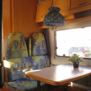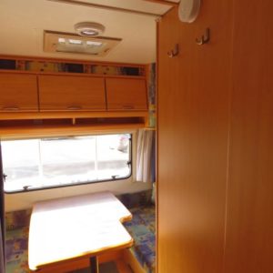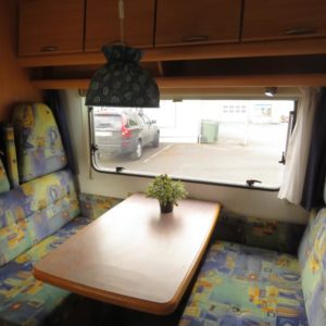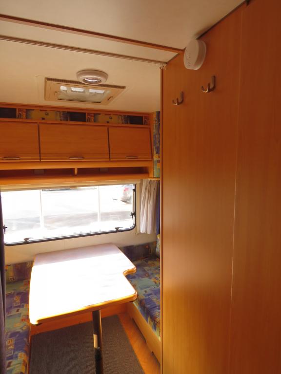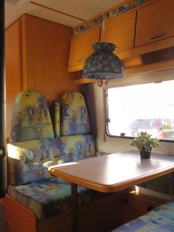 Toimiva kahden pöytäryhmän pohjaratkaisu. Molemmat pöytäryhmät sijattavissa tarpeen mukaan vuoteiksi. Lisäksi leveä alkovivuode edessä.