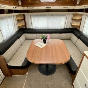 Vaunun takaosasta löytyy viihtyisä ja todella valoisa pöytäryhmä, jonka ympärlle mahtuu mukavasti 6 henkeä nauttimaan vaikka hyvästä ruoasta.