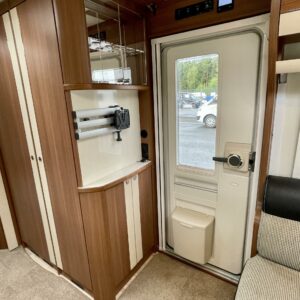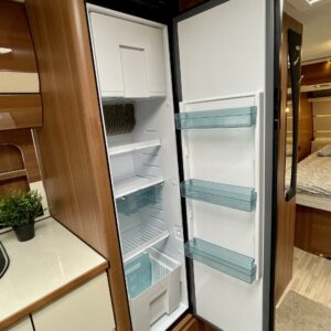 Vaunun keskivaiheilta löytyy täyskorkeat vaatekaapit ja isolla jääkaappi- pakastimella varustettu keittiö.
