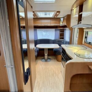 Pohjaratkaisussa edessä U- Sohvaryhmä josta pedattavissa lisävuode. Keskiosassa keittiö reilunkokoisella jääkaappipakastin- yhdistelmällä sekä kaasu-uunilla. Keskiosassa myös Wc-tila. Takaosassa erillisvuoteet.
